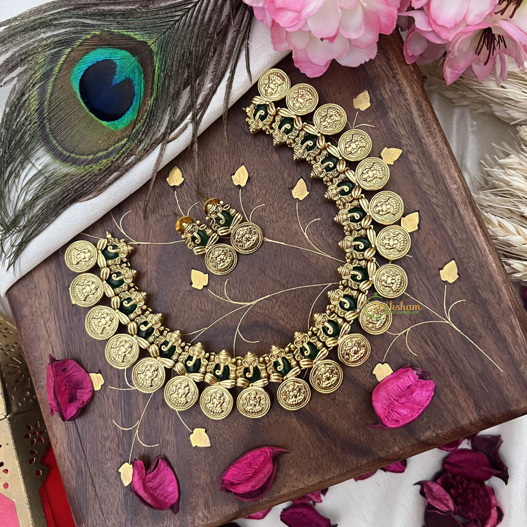 Introducing the exquisite Vriksham Gold Look Alike Ganesha With Lakshmi Coin Short Neckpiece. This stunningly crafted piece features a beautiful Ganesha pendant with a Lakshmi coin, symbolizing prosperity and good fortune. The perfect accessory for an elegant and exclusive look. Enhance your style and invite blessings with this luxurious neckpiece.