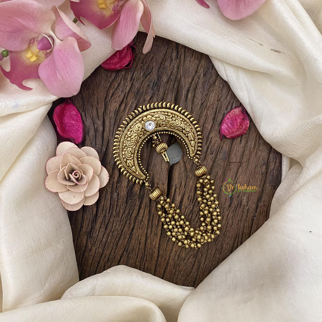 Elevate your style with Vriksham's Gold Look Alike Golden Pearls Single Jada Billai. Featuring a single brilliant White stone, this hair accessory exudes luxury and sophistication. Add a touch of art and fashion to your look with this exclusive piece.