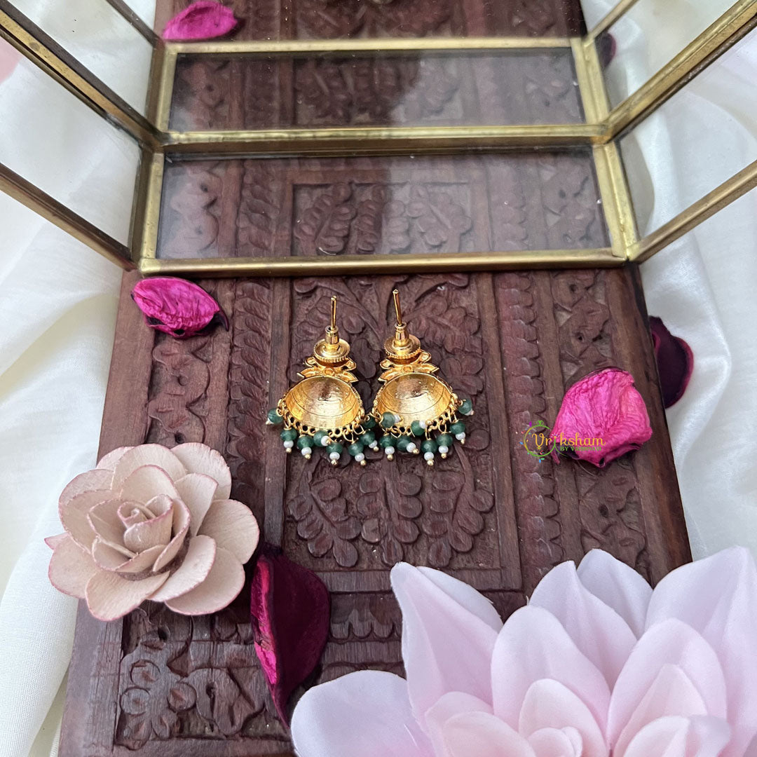 Embrace refined minimalism with our Vriksham Gold Look Alike Half Jhumka. These distinguished earrings feature an elegant half-dome silhouette adorned with verdant green elements and delicate pastel green beads, creating a harmonious palette inspired by nature's tranquility. The premium gold-tone finish elevates the sophisticated design while ensuring versatile wearability. Perfect for the discerning individual seeking understated luxury that complements both traditional ensembles and contemporary attire with effortless elegance.
