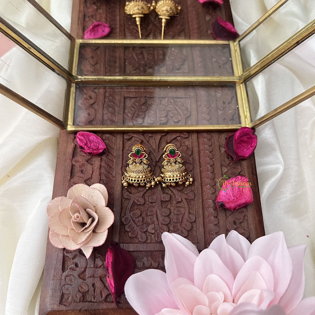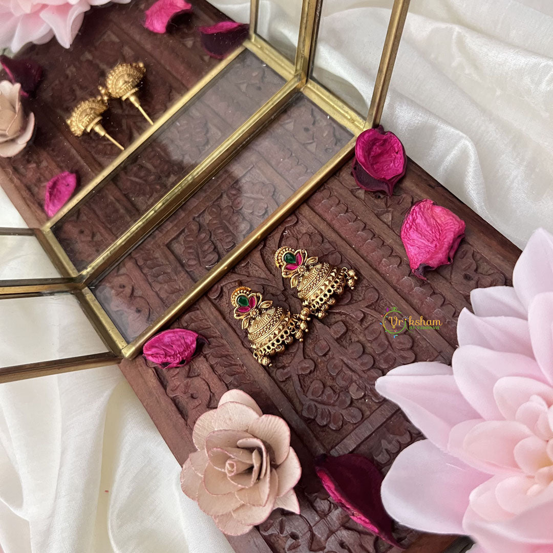 Embrace refined minimalism with our Vriksham Gold Look Alike Half Jhumka. These distinguished earrings feature an elegant half-dome silhouette adorned with verdant red green elements and delicate gold beads, creating a harmonious palette inspired by nature's tranquility. The premium gold-tone finish elevates the sophisticated design while ensuring versatile wearability. Perfect for the discerning individual seeking understated luxury that complements both traditional ensembles and contemporary attire with effortless elegance.