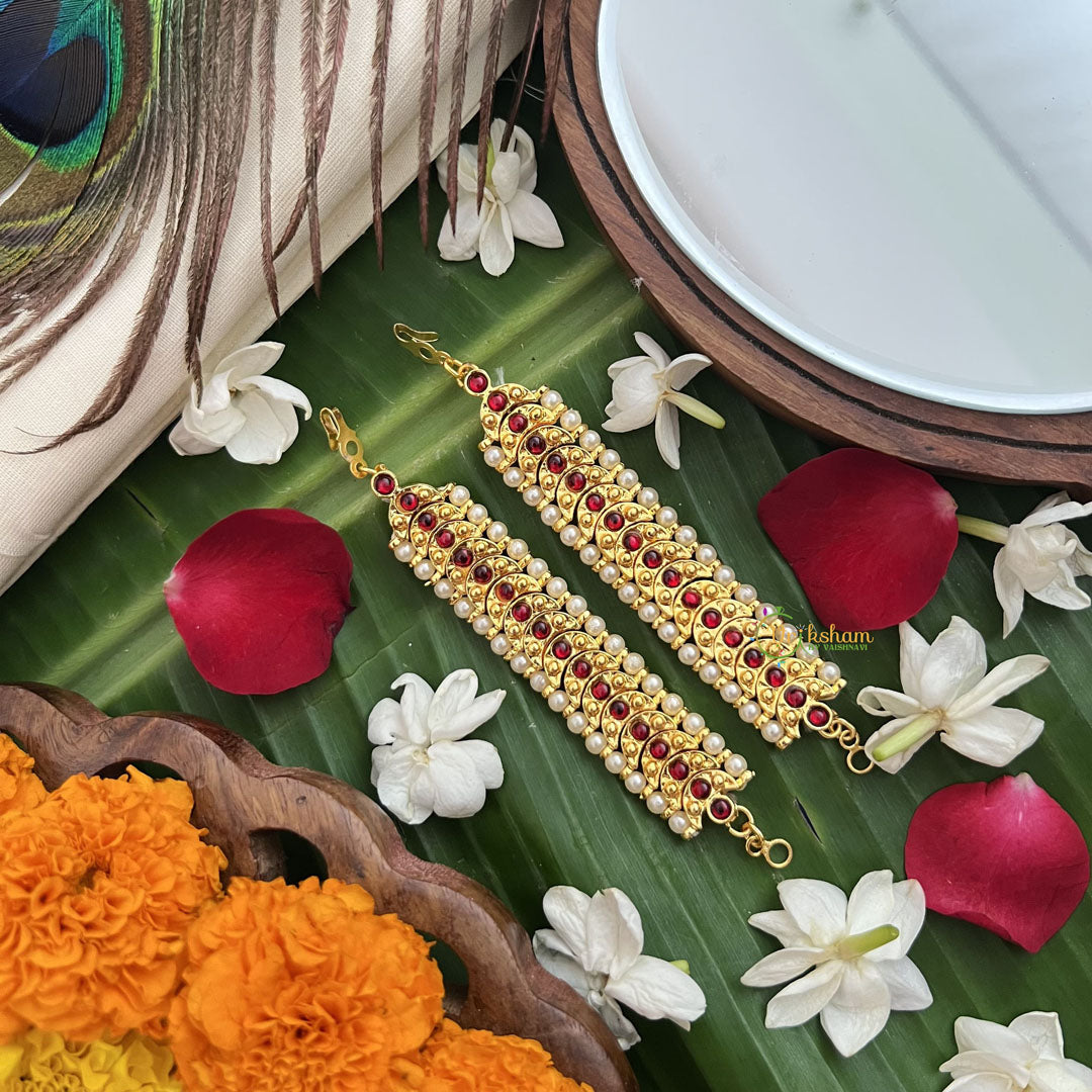 The Vriksham Gold Look Alike Half Moon Red Traditional Kemp Maatil features a graceful half-moon design adorned with vibrant red kemp stones and delicate pearl accents. This gold-look piece combines classic motifs with refined craftsmanship, offering a sophisticated accessory that beautifully complements traditional attire for special occasions.