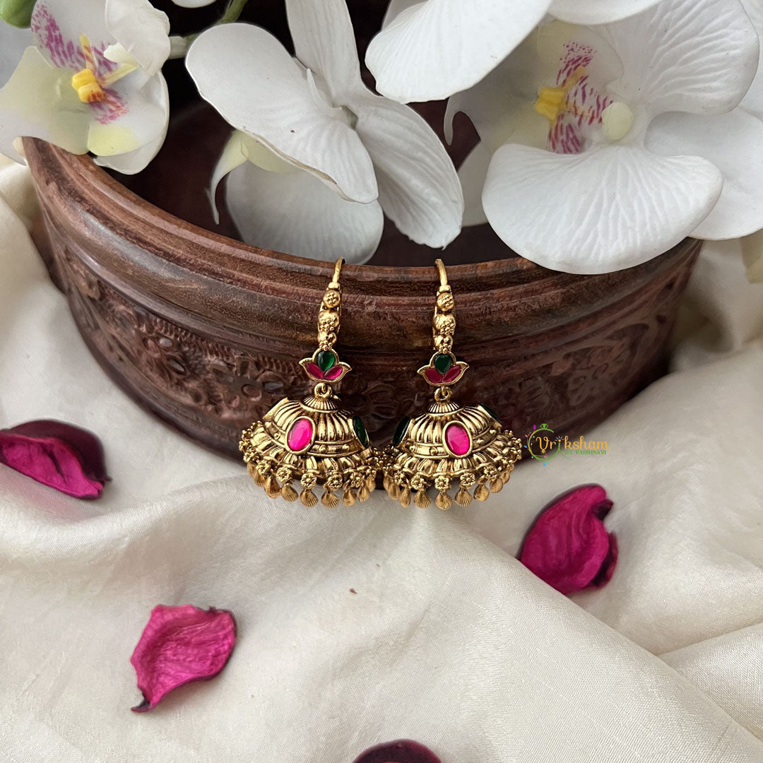 Embrace verdant elegance with our Vriksham Gold Look Alike Hook Jhumka. These distinguished earrings feature a refined hook design adorned with lush red and green elements and opulent gold beads, creating a harmonious balance of natural splendor and luxurious warmth. The premium gold-tone finish elevates the sophisticated silhouette while ensuring versatile wearability. Perfect for the discerning individual seeking to add a touch of understated refinement to both traditional ensembles and contemporary attire.