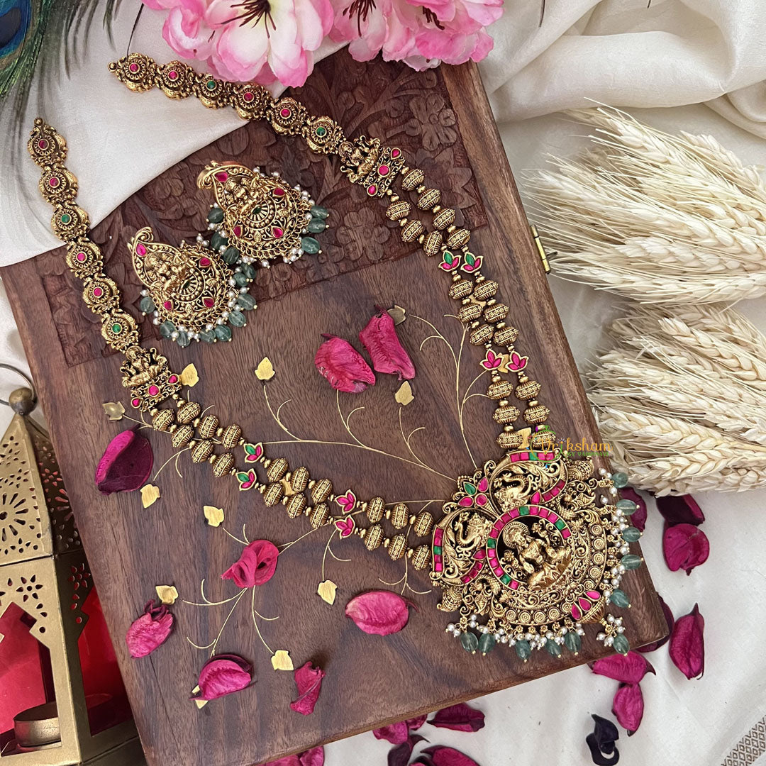 Elevate your wardrobe with the sophisticated Vriksham Gold Look Alike Lakshmi 2 Layer Long Neckpiece. Featuring a beautiful combination of red, green, and pastel green beads, this necklace exudes luxury and exclusivity. The intricate Lakshmi design adds a touch of elegance to any outfit. Elevate your style and make a statement with this stunning piece.