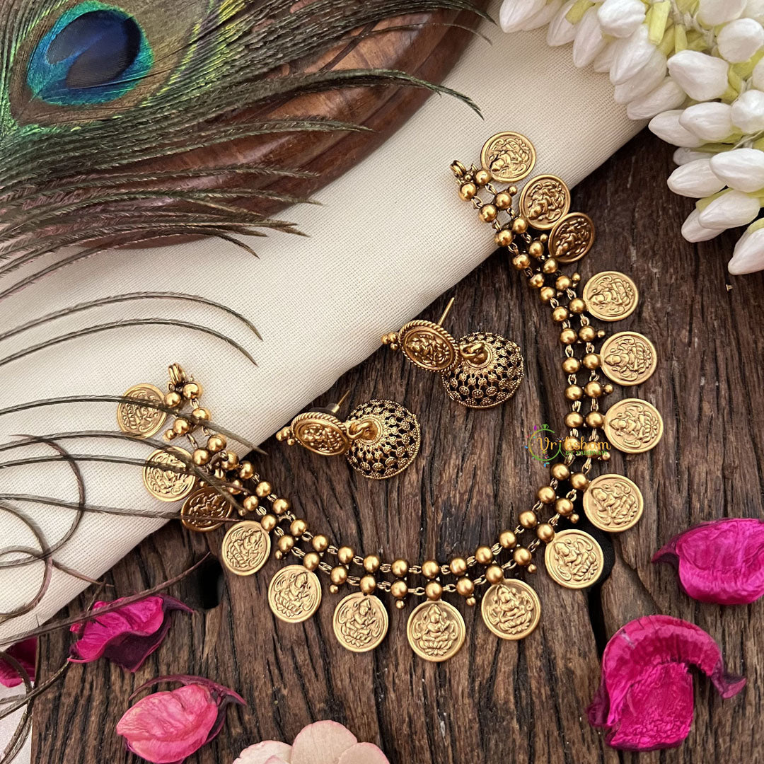 The Vriksham Gold Look Alike Lakshmi Coin Neckpiece showcases a beautifully crafted Lakshmi coin pendant with a rich gold-like finish. This elegant piece combines traditional symbolism with contemporary style, making it a refined accessory for both festive occasions and everyday wear. Its intricate design and timeless appeal enhance any ensemble with grace and sophistication.