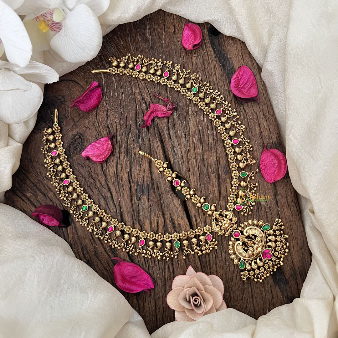 The Vriksham Gold Look Alike Lakshmi Floral Double Side Maang Tikka features an elegant design inspired by traditional Lakshmi motifs, adorned with vibrant red and green accents and delicate gold beads. This sophisticated piece adds a regal and timeless charm to your ensemble, perfect for enhancing your look with refined beauty on special occasions.