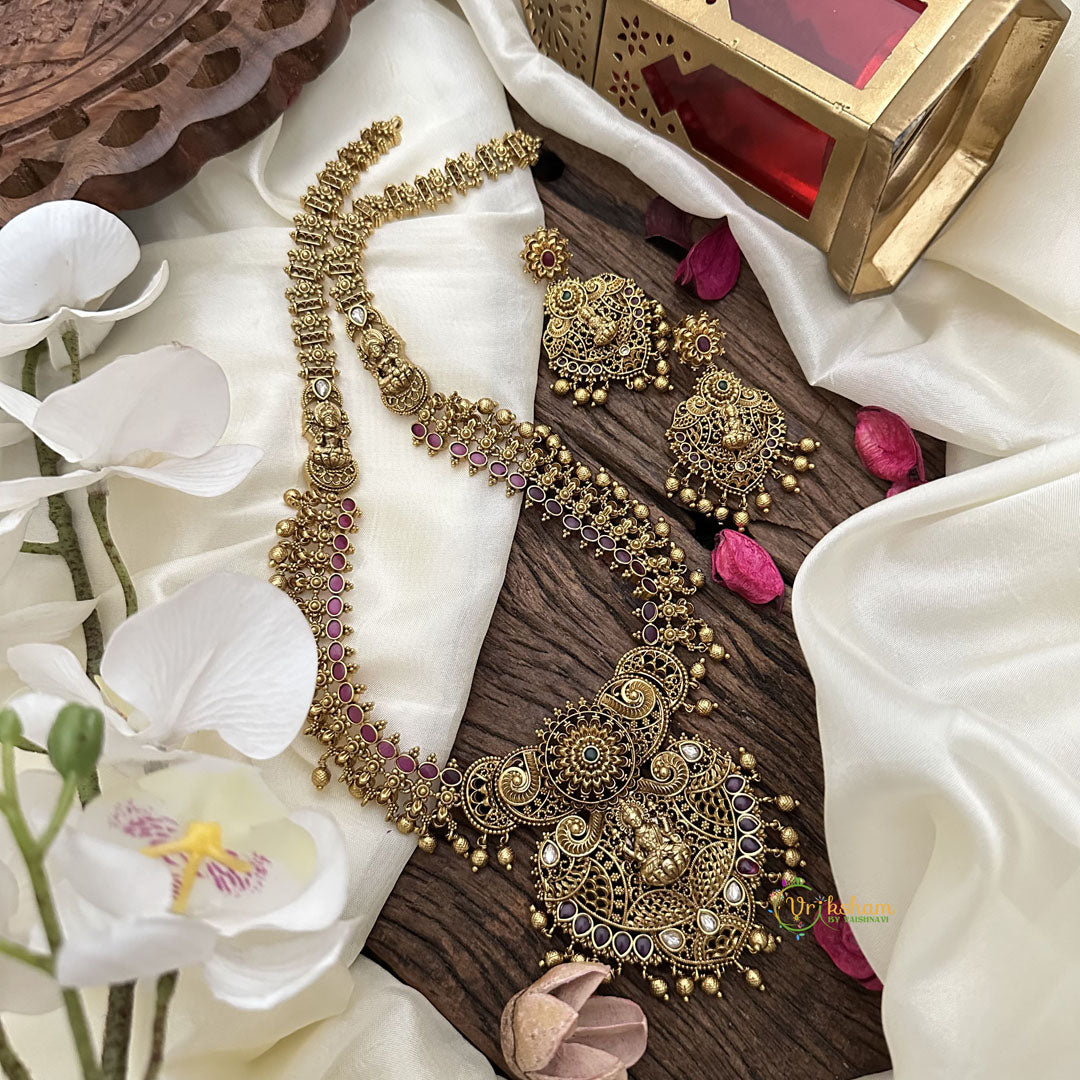 Elevate your style with our Vriksham Gold Look Alike Lakshmi Long Neckpiece. Crafted with intricate detail, this statement piece features beautiful gold beads and a stunning Lakshmi pendant. Exude luxury and grace with this exclusive piece, perfect for any elegant occasion.