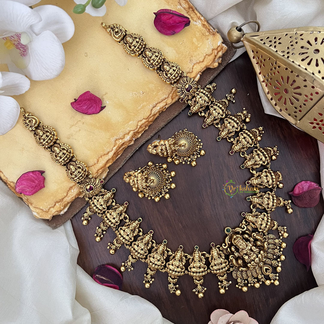 Indulge in the luxurious Vriksham Gold Look Alike Lakshmi Long Neckpiece adorned with intricate detailing and shimmering gold beads. With its elegant design inspired by the goddess Lakshmi, this neckpiece exudes exclusivity and sophistication, making it the perfect addition to your collection.