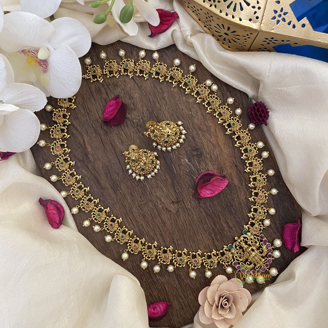 Indulge in the opulence of Vriksham Gold Look Alike Lakshmi Long Neckpiece. The intricate craftsmanship and rich color combination of red and green make a bold statement of luxury. A perfect blend of ancient tradition and modern flair, this piece will elevate any outfit and add a touch of elegance to your look.