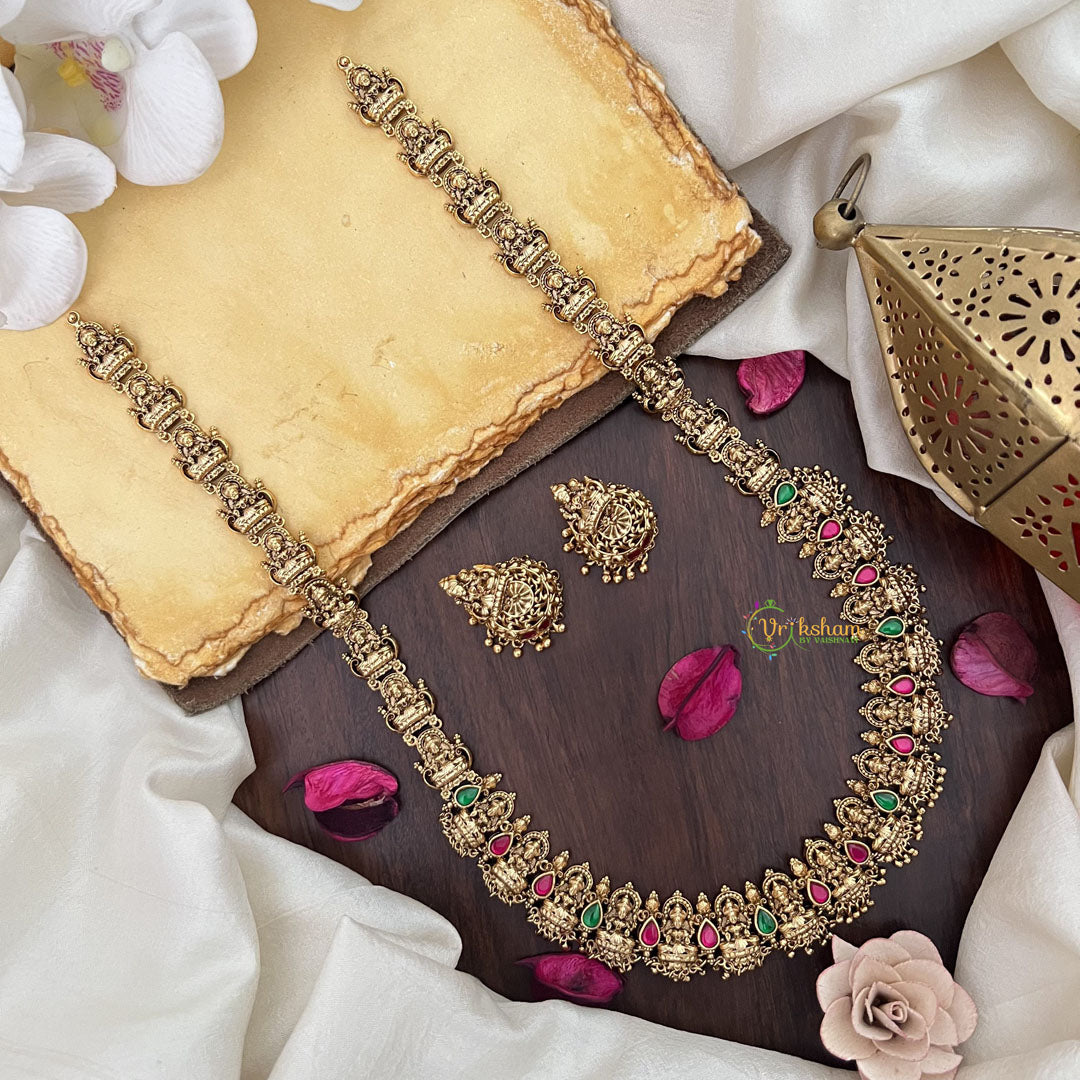Indulge in luxury with our Vriksham Gold Look Alike Lakshmi Long Neckpiece. Adorned with stunning red and green accents, this elegant piece exudes sophistication. The intricate Lakshmi design and lustrous gold pearls add a touch of exclusivity to any outfit. Elevate your style with this premium accessory.