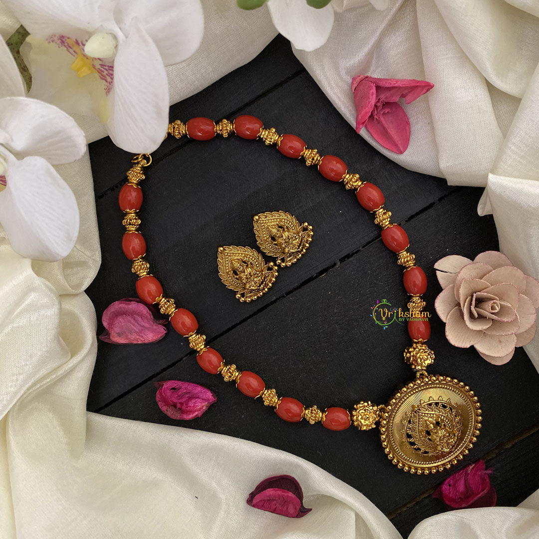 Indulge in luxury with our Vriksham Gold Look Alike Lakshmi Pendant Coral Bead neckpiece. With intricate detailing and a stunning design, this pendant will add a touch of elegance to any outfit. Embrace the goddess of wealth with this exclusive piece and stand out in style.