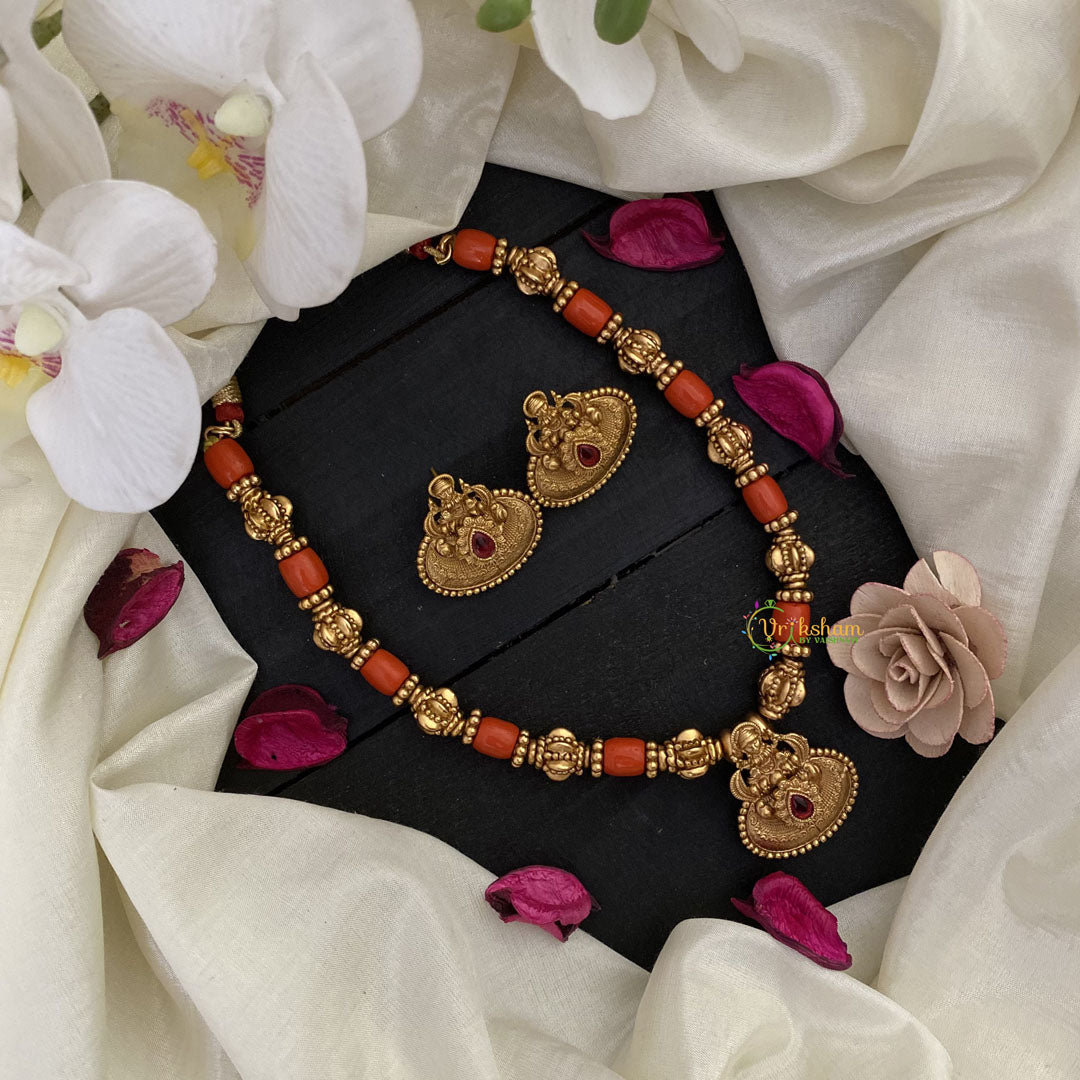 Embody elegance and beauty with our Vriksham Gold Look Alike Lakshmi Pendant Coral Beaded Mala. Adorned with a stunning pendant and delicate coral beads, this necklace exudes luxury and sophistication. Enhance your style and channel goddess Lakshmi's blessings with this exquisite piece.