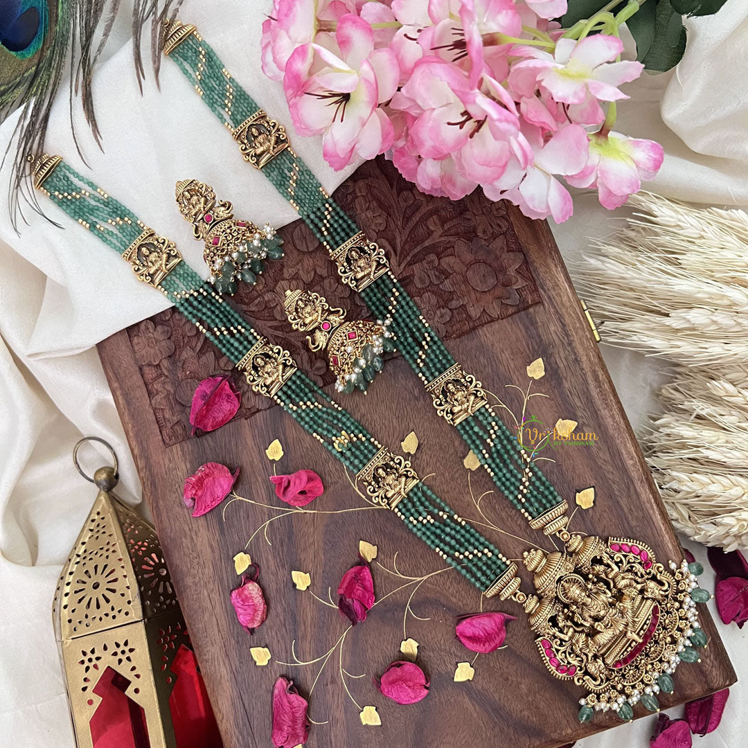 Introducing our Vriksham Gold Look Alike Chandbali Pendant Long Neckpiece, featuring a delicate pastel green bead. This exquisite piece exudes elegance and sophistication, perfect for adding a touch of luxury to any outfit. Elevate your style with Vriksham.
