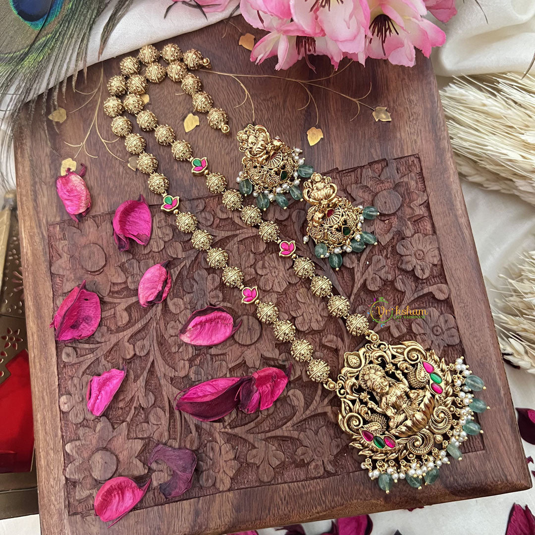 Exude luxury and sophistication with our Vriksham Gold Look Alike Lakshmi Pendant Long Neckpiece. Adorned with vibrant red, green, and aqua green beads, this necklace is a true work of art. Flaunt this exclusive piece, featuring the goddess Lakshmi, and elevate your style to the next level.