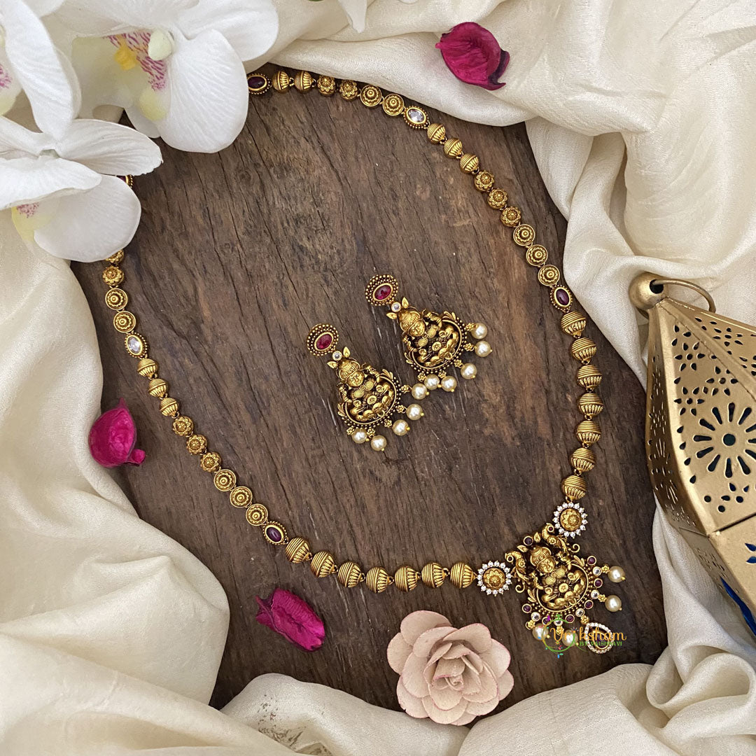 Elevate your style with Vriksham's Gold Look Alike Lakshmi Pendant Long Neckpiece in stunning red and white. This luxurious piece features intricate details reminiscent of ancient art and showcases the goddess Lakshmi, symbolizing wealth and prosperity. Make a statement with this exclusive and elegant accessory.