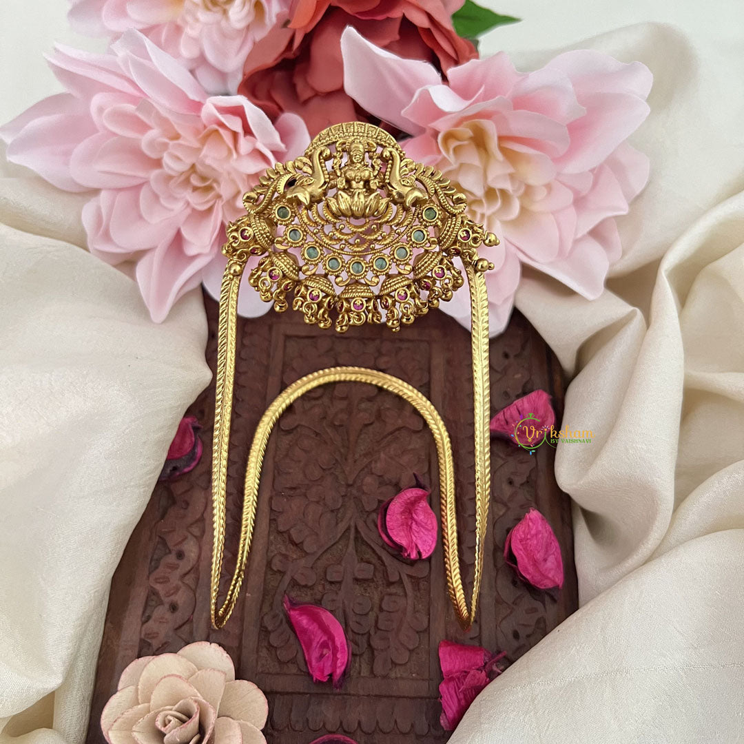 The Vriksham Gold Look Alike Lakshmi with Dual Elephant Vangi is an exquisite armlet that combines traditional motifs with refined craftsmanship. Featuring rich red and green hues accented by gold beads, this piece showcases Goddess Lakshmi flanked by two elegant elephants, symbolizing prosperity and strength. Perfect for enhancing your ceremonial attire, it offers a sophisticated touch of cultural elegance.