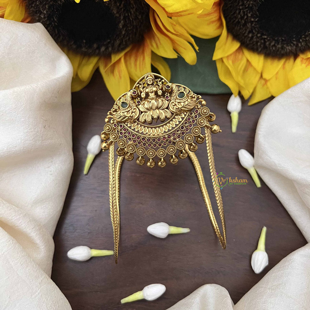 Embrace prosperity and grace with this stunning Lakshmi Vangi Armlet, featuring an enchanting dual peacock design in vibrant red and green hues. Crafted with gold-look alike materials and complemented by radiant gold beads, this piece captures the essence of wealth and abundance associated with Goddess Lakshmi. The intricate peacock motifs symbolize beauty and elegance, while the rich color palette adds a regal dimension to your spiritual jewelry collection. Ideal for those seeking to blend devotional significance with sophisticated style, this armlet serves as a timeless accessory for both everyday wear and festive occasions.