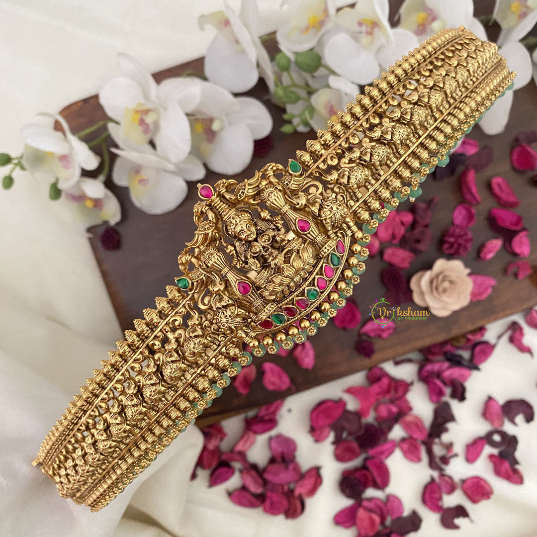 Adorn your waist with the exquisite Vriksham Gold Look Alike Lakshmi With Elephants Hipbelt. Featuring pastel green beads and intricate Lakshmi and elephant designs, this belt exudes luxury and sophistication. Elevate any outfit with this tasteful and exclusive accessory.