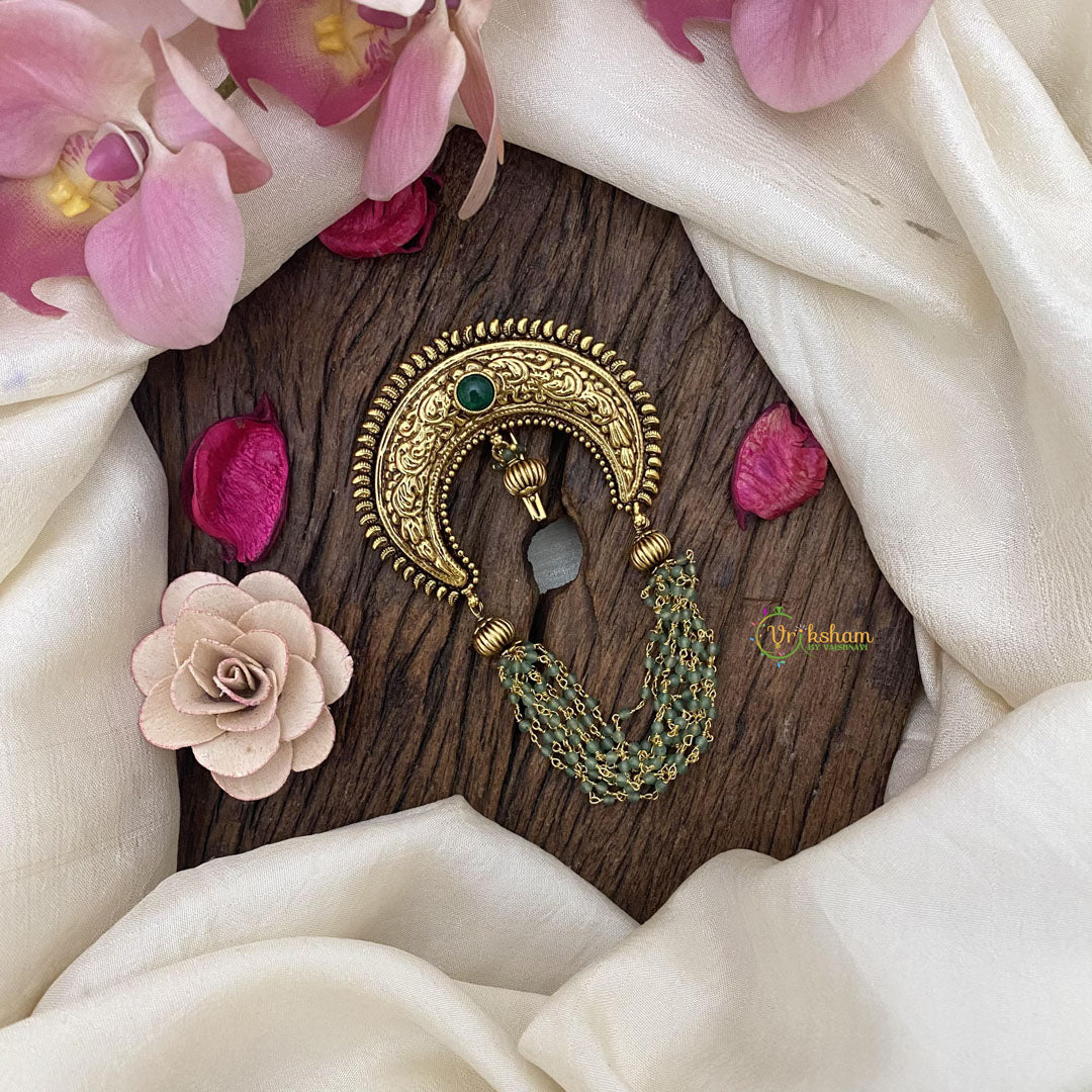 Elevate your style with Vriksham's Gold Look Alike Pastel Green Pearls Single Jada Billai. Featuring a single brilliant Green stone, this hair accessory exudes luxury and sophistication. Add a touch of art and fashion to your look with this exclusive piece.