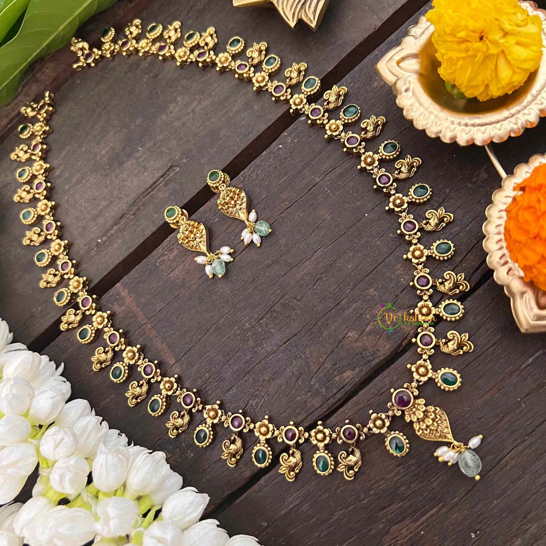 Introducing our Vriksham Precious Kemp Reversible Pendant Peacock Haram-Gold Bead, a luxurious and versatile piece that can transform any outfit. Adorned with precious kemp stones and a reversible peacock pendant, this haram necklace will add a touch of sophistication and elegance to your style. The green beads add a pop of color, making it a unique and eye-catching accessory. Elevate your look with this exquisite piece from Vriksham.