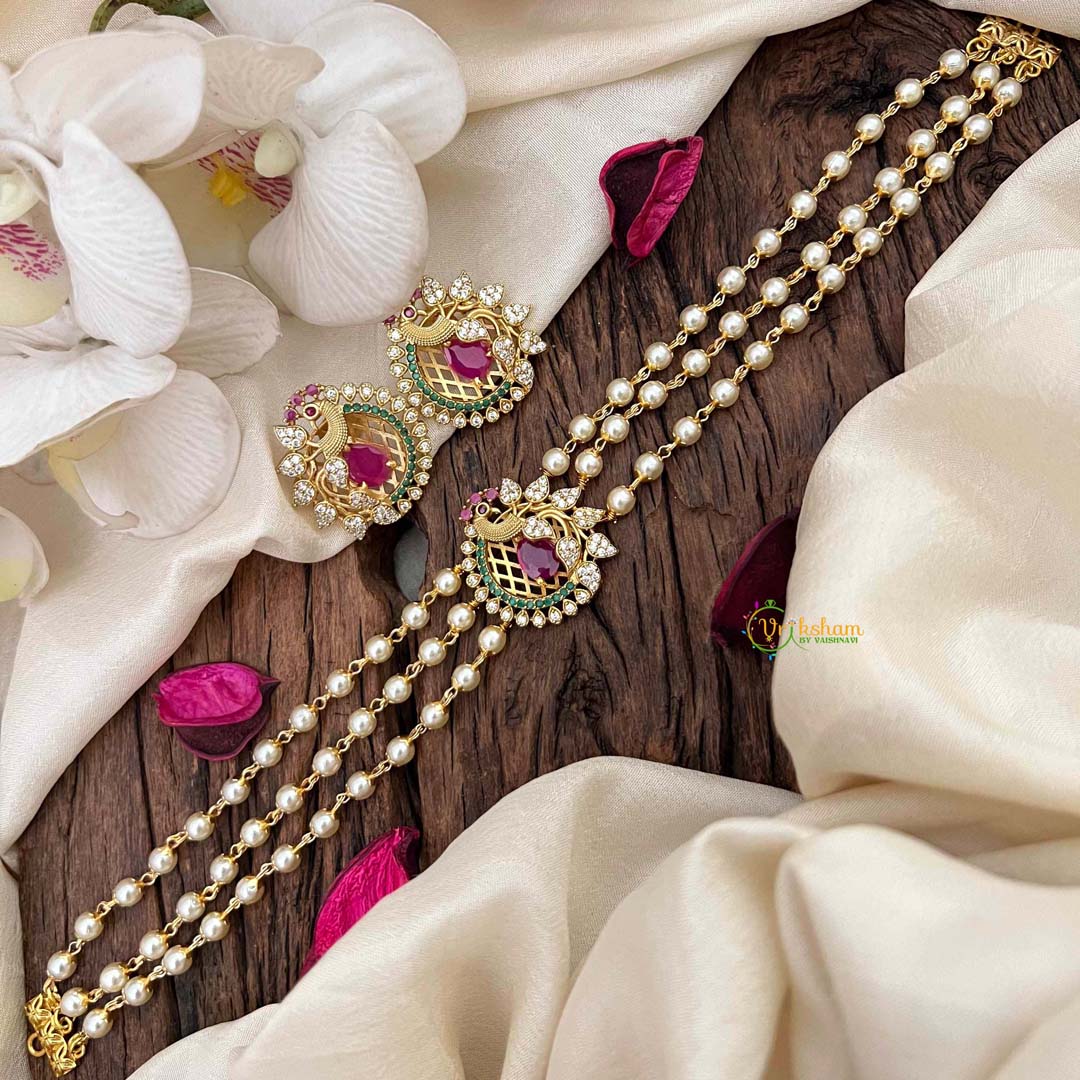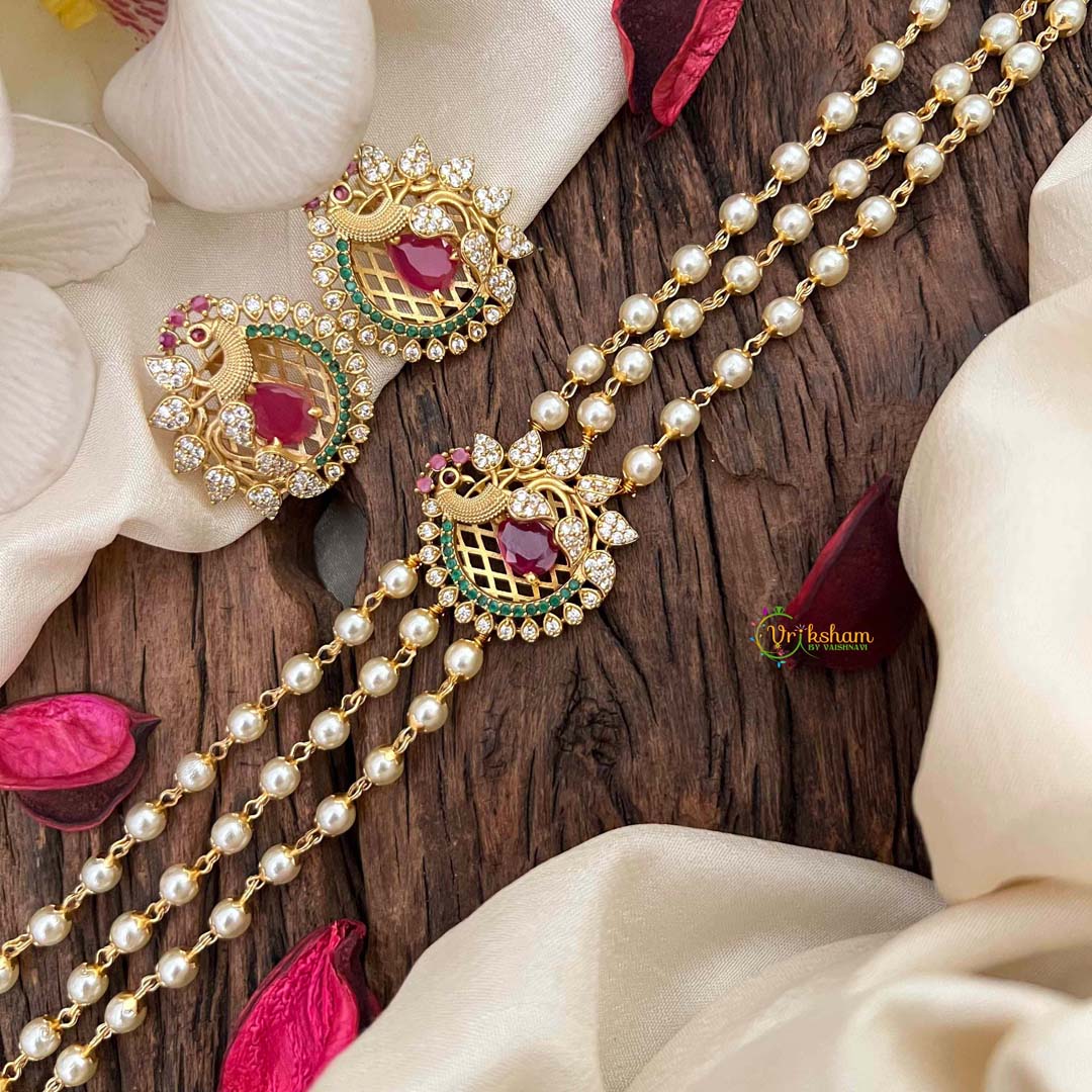 Elevate your ethnic ensemble with this exquisite high neck choker, crafted with lustrous pearl-like beads in a sophisticated gold-tone finish. The striking peacock-inspired design features vibrant red and green hues that capture traditional artistry with contemporary elegance. This statement piece sits gracefully at the neckline, perfect for festive occasions, weddings, or cultural celebrations. The right-side peacock motif adds an asymmetrical charm that complements both traditional and fusion wear. Ideal for those seeking refined jewelry that blends timeless craftsmanship with modern style sensibilities.
