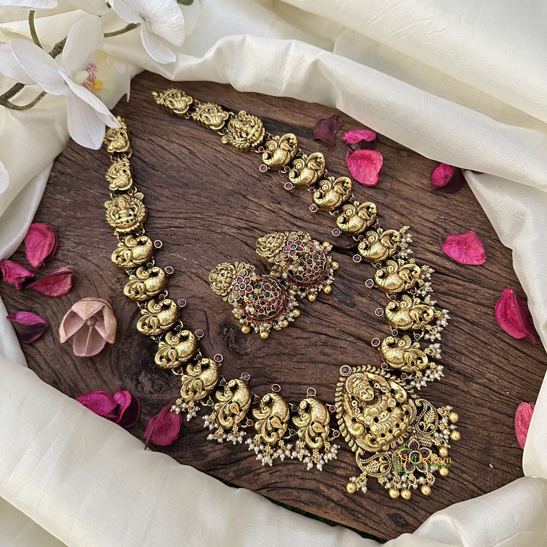 Elevate your style with our Vriksham Premium Lakshmi Peacock Neckpiece. Adorned with delicate pearls and gold beads, this exquisite neckpiece exudes sophistication and elegance. Inspired by the majestic peacock, it brings a touch of opulence to any outfit. Treat yourself to a truly exclusive piece.