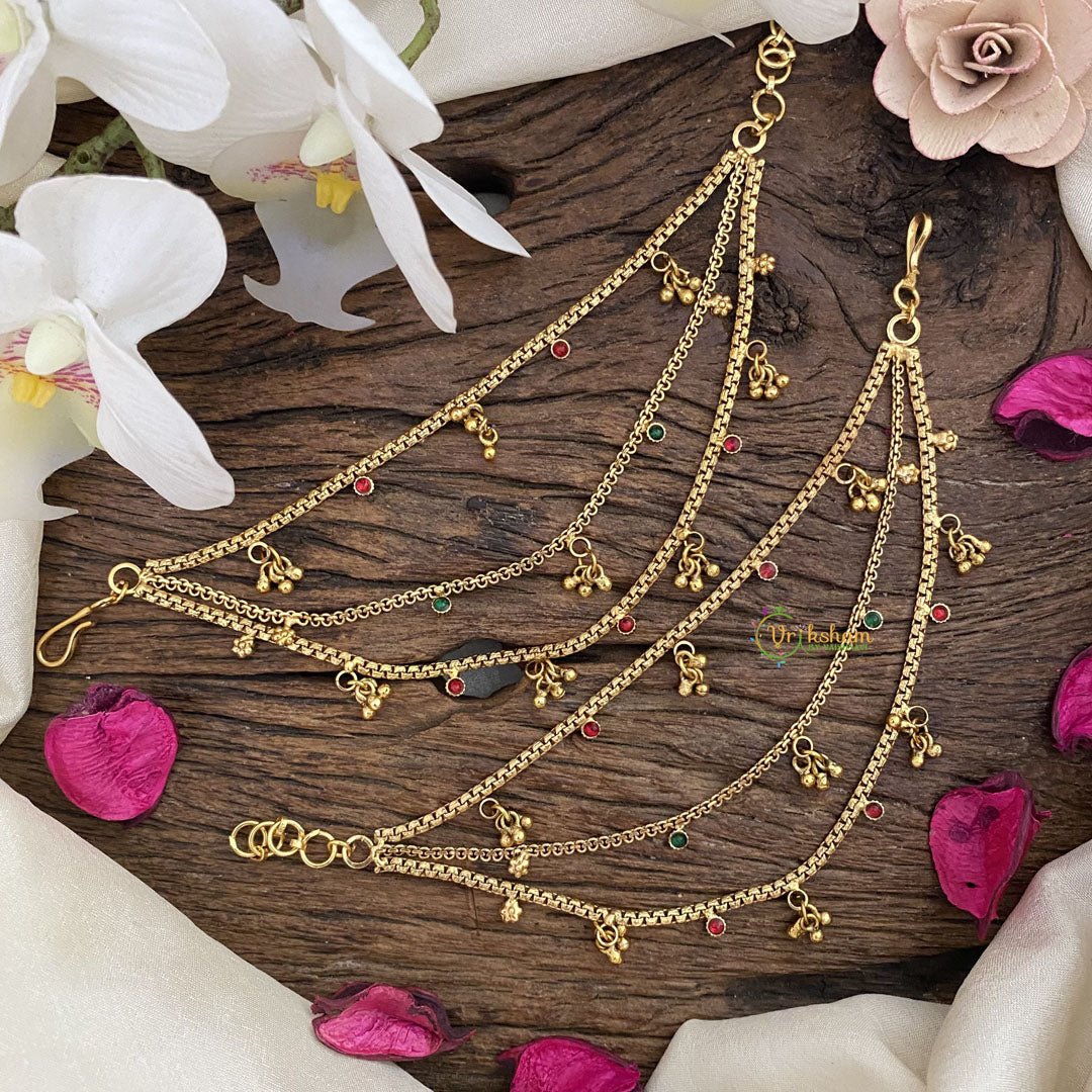Indulge in elegance with Vriksham's Gold Look Alike Red Green Stone with Ghungroo Maatil. This exquisite piece features a beautiful combination of red and green stones, perfectly crafted to resemble real gold. Its intricate design and accompanying ghungroo add a touch of sophistication to any outfit. Elevate your style with Vriksham.