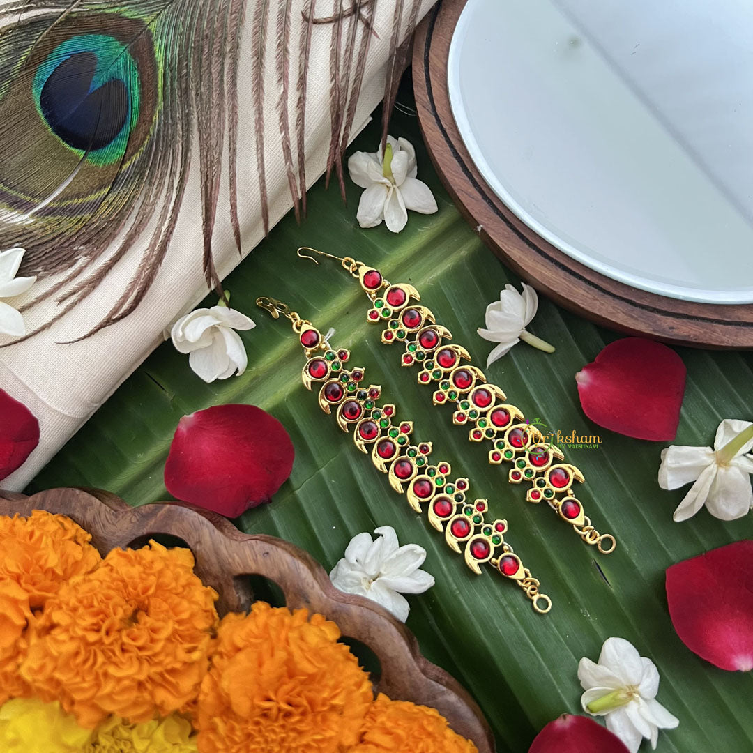 The Vriksham Gold Look Alike Round & Three Dot Traditional Kemp Maatil features a sophisticated design combining classic round and three-dot motifs adorned with vibrant red and green kemp stones. This elegant piece offers the rich appearance of gold plating, enhancing traditional attire with timeless charm and refined beauty, perfect for special occasions.
