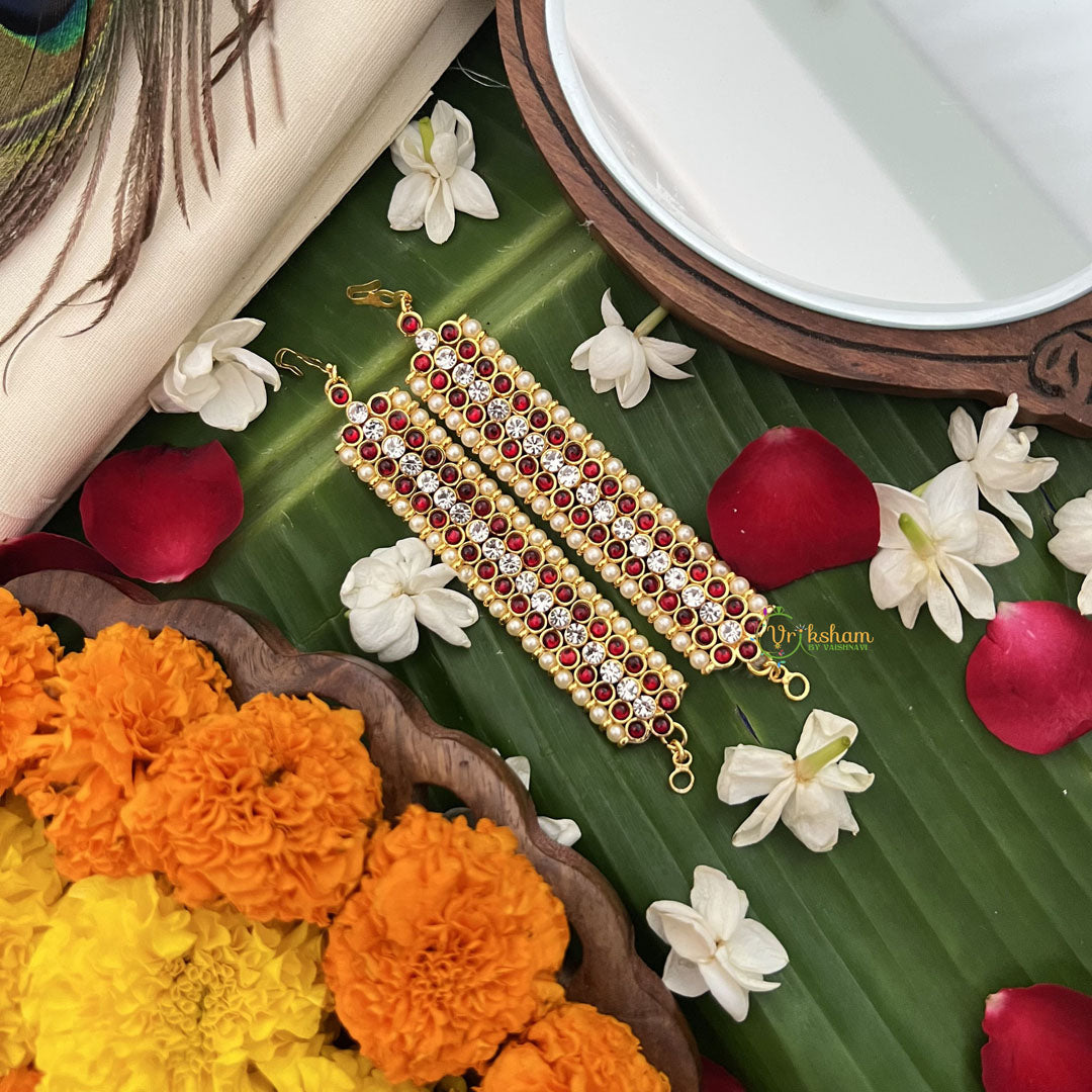 The Vriksham Gold Look Alike Three Line Traditional Kemp Maatil features a refined design with striking red and white kemp stones, elegantly accented by delicate pearls. This gold-look piece combines classic motifs with sophisticated craftsmanship, offering a timeless accessory that enhances traditional attire with grace and elegance.