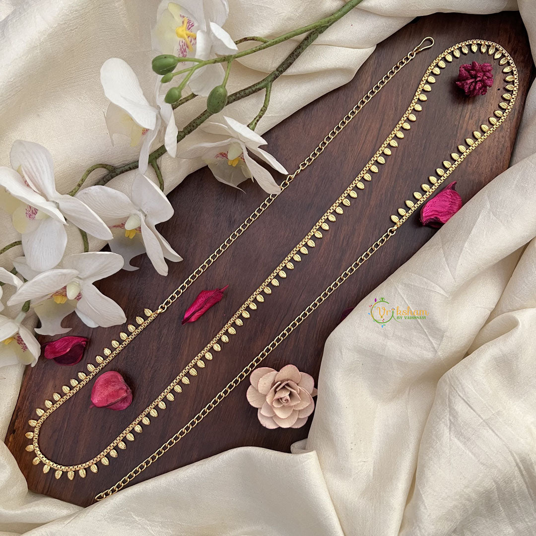 Add a touch of elegance to your ensemble with the Vriksham Gold Look Alike Unique Leaf Thin Hip Chain. Crafted with intricate leaf designs, this hip chain exudes a sophisticated and exclusive charm. Its gold look-alike material adds a touch of luxury, making it the perfect accessory for your next upscale event.
