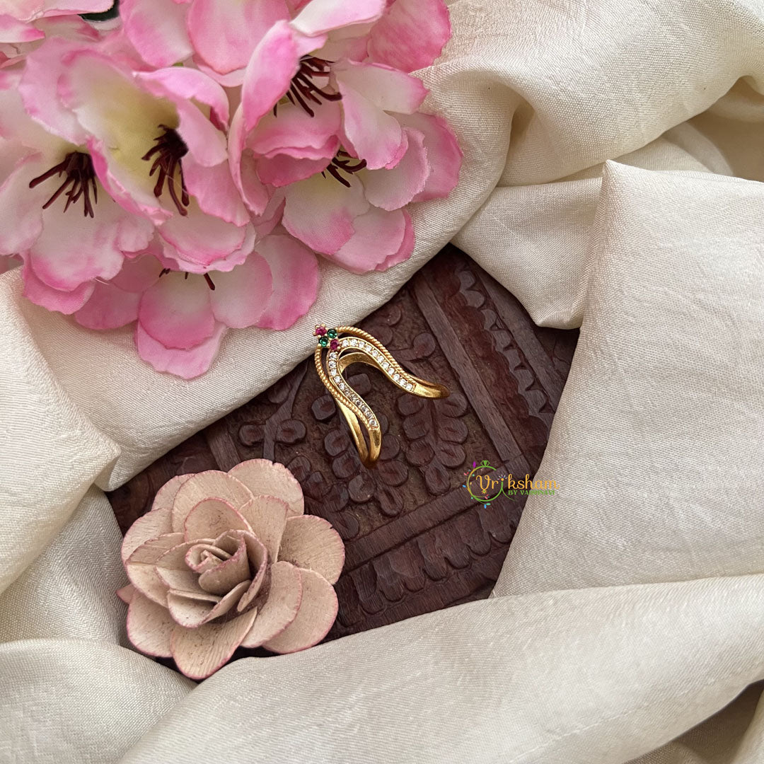 The Vriksham Gold Look Alike Unique Vangi Finger Ring features a harmonious blend of red, green, and white accents set against a refined gold-look base. This distinctive design enhances your elegance while offering a vibrant, timeless appeal. Ideal for those who appreciate sophisticated jewelry that effortlessly balances color and style.