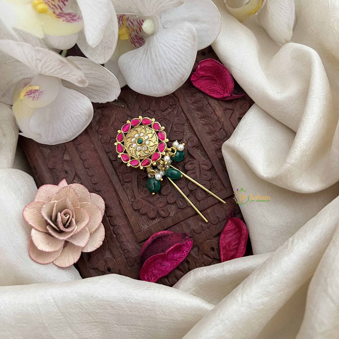 The Vriksham Gold Look Floral Style Kundan Jadau Jada Billai features a sophisticated floral design embellished with red, white, and green stones, complemented by a rich green bead. Its gold-tone finish adds warmth and elegance, making it a perfect accessory to enhance traditional hairstyles for weddings and special occasions.