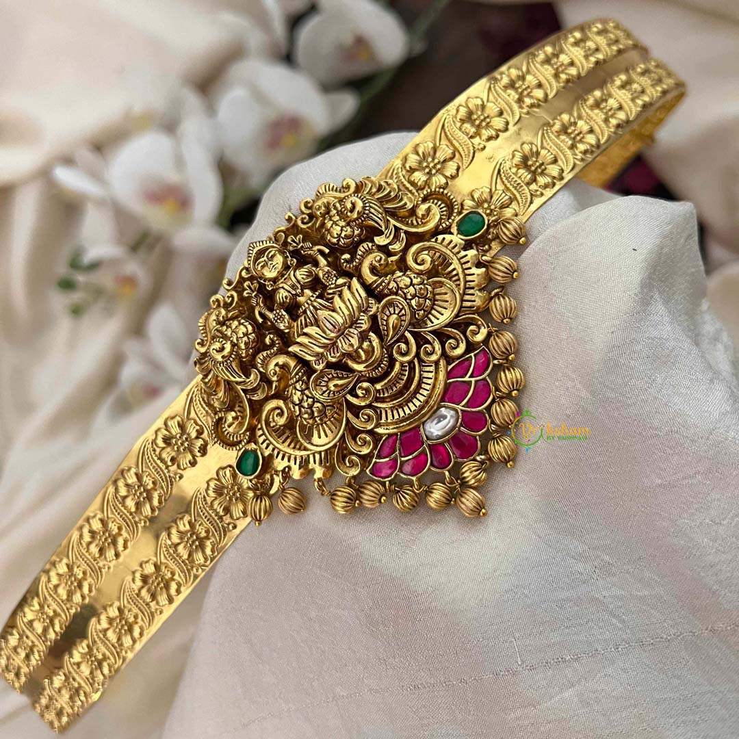Elevate your style with our exquisite Vriksham Gold Look Lakshmi Pendant. Adorned with a beautiful floral design and gold beads, this elegant hipbelt is perfect for any occasion. Experience the luxury of our premium product and stand out from the rest