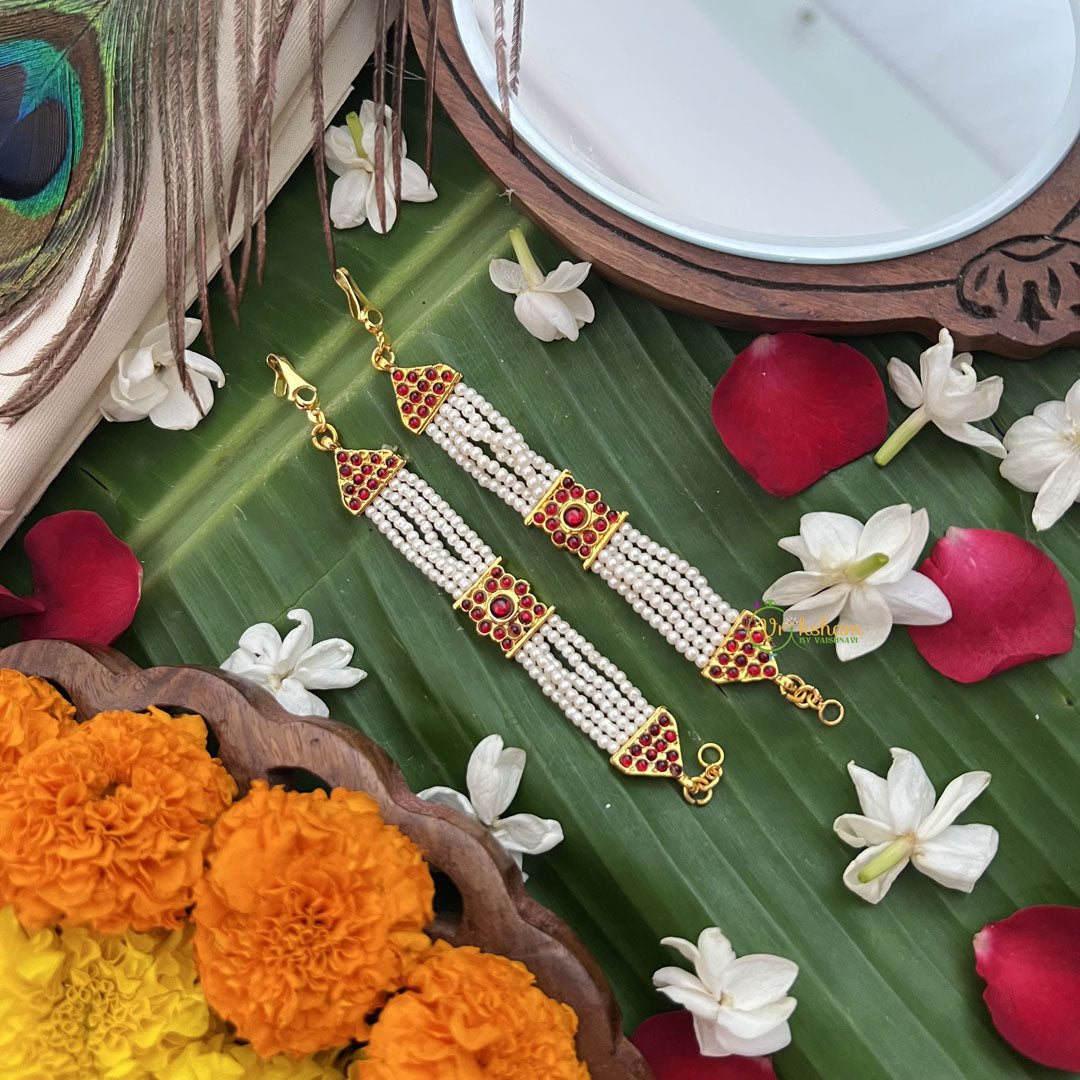 The Vriksham Gold Look Square Pearl Style Traditional Kemp Maatil features a sophisticated square design adorned with vibrant red kemp stones and delicate pearl accents. This gold-look piece combines intricate craftsmanship with timeless elegance, making it a refined accessory to beautifully complement traditional attire for special occasions.