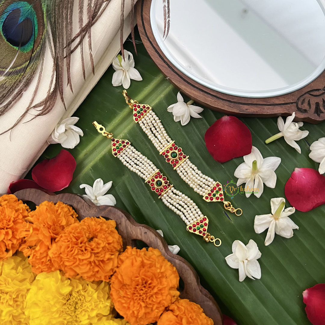 The Vriksham Gold Look Square Pearl Style Traditional Kemp Maatil features a refined square design adorned with vibrant red and green kemp stones, enhanced by delicate pearl accents. This gold-look piece combines intricate craftsmanship with timeless elegance, offering a sophisticated accessory that beautifully complements traditional attire for special occasions.