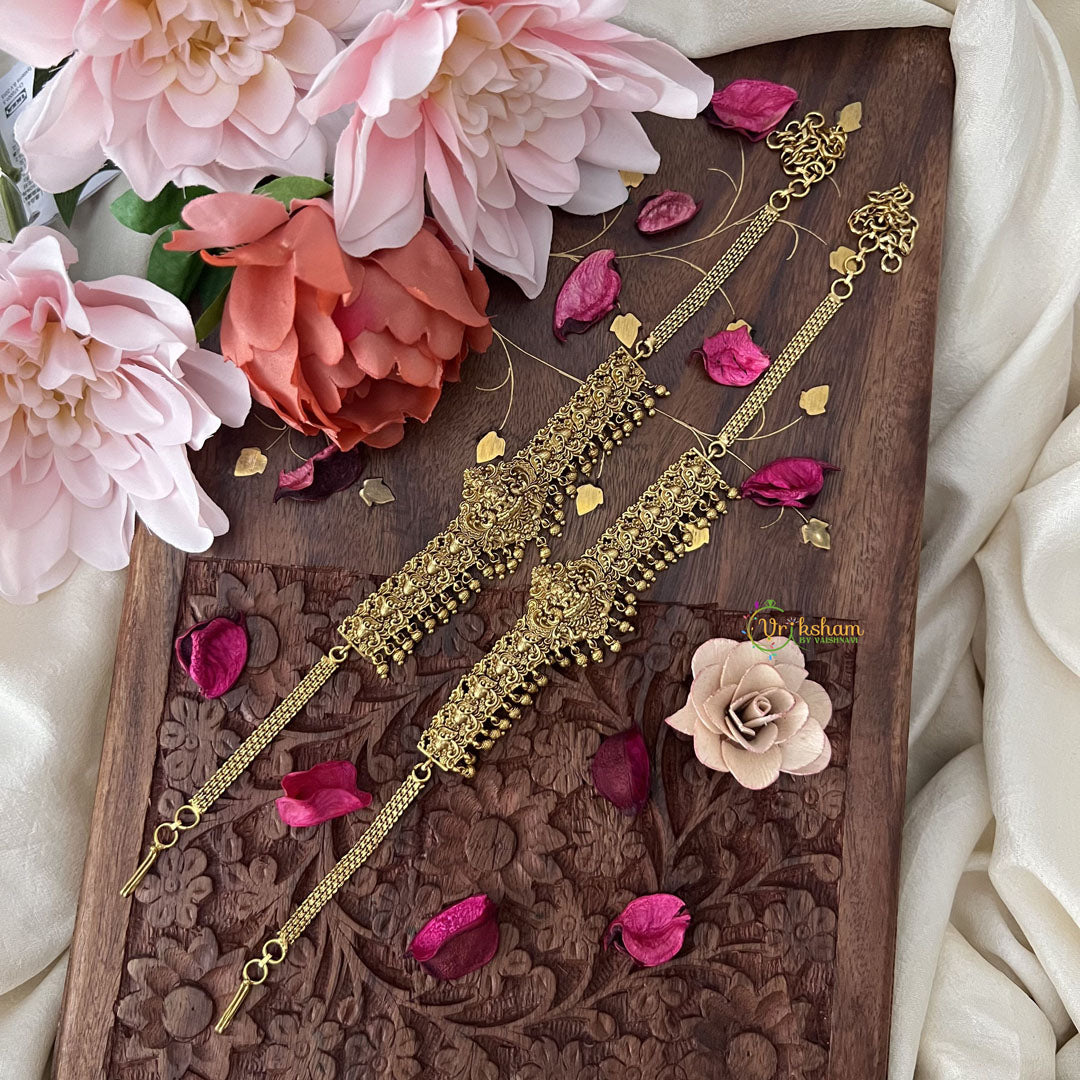 Elevate your style with our Vriksham Gold Pecock Lakshmi Vangi / Armlets in Small Golden Beds. Featuring exquisite peacock and Lakshmi motifs, these armlets add a touch of opulence to any outfit. Made with premium gold, they are the perfect statement piece for any occasion.