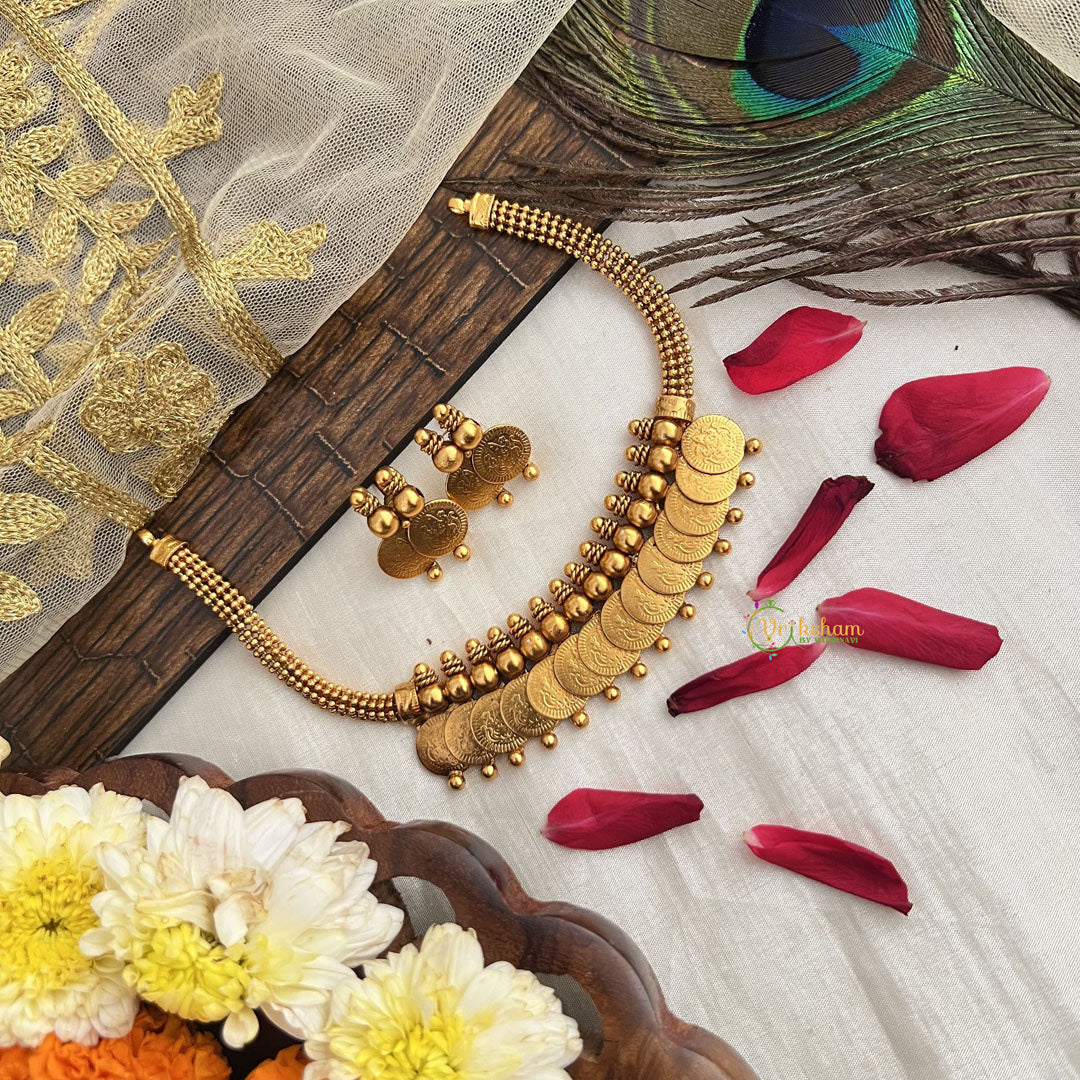 The Vriksham Gold Plated 14 Lakshmi Coin Neckpiece features fourteen intricately designed gold-plated coins, each adorned with the divine Lakshmi motif. This sophisticated piece combines traditional symbolism with exquisite craftsmanship, making it a timeless accessory that adds elegance and cultural richness to your festive or formal attire.