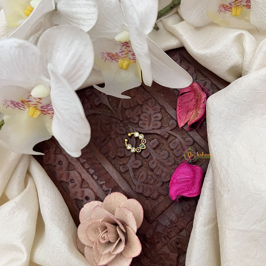 Elevate your style with the Vriksham Gold-Plated Diamond-Stone Septum Ring, featuring a refined blend of red, green, and white stones. Expertly crafted with a radiant gold plating, this septum ring adds a touch of elegance and vibrant color to any look. Perfect for those seeking a sophisticated accessory that subtly highlights individuality