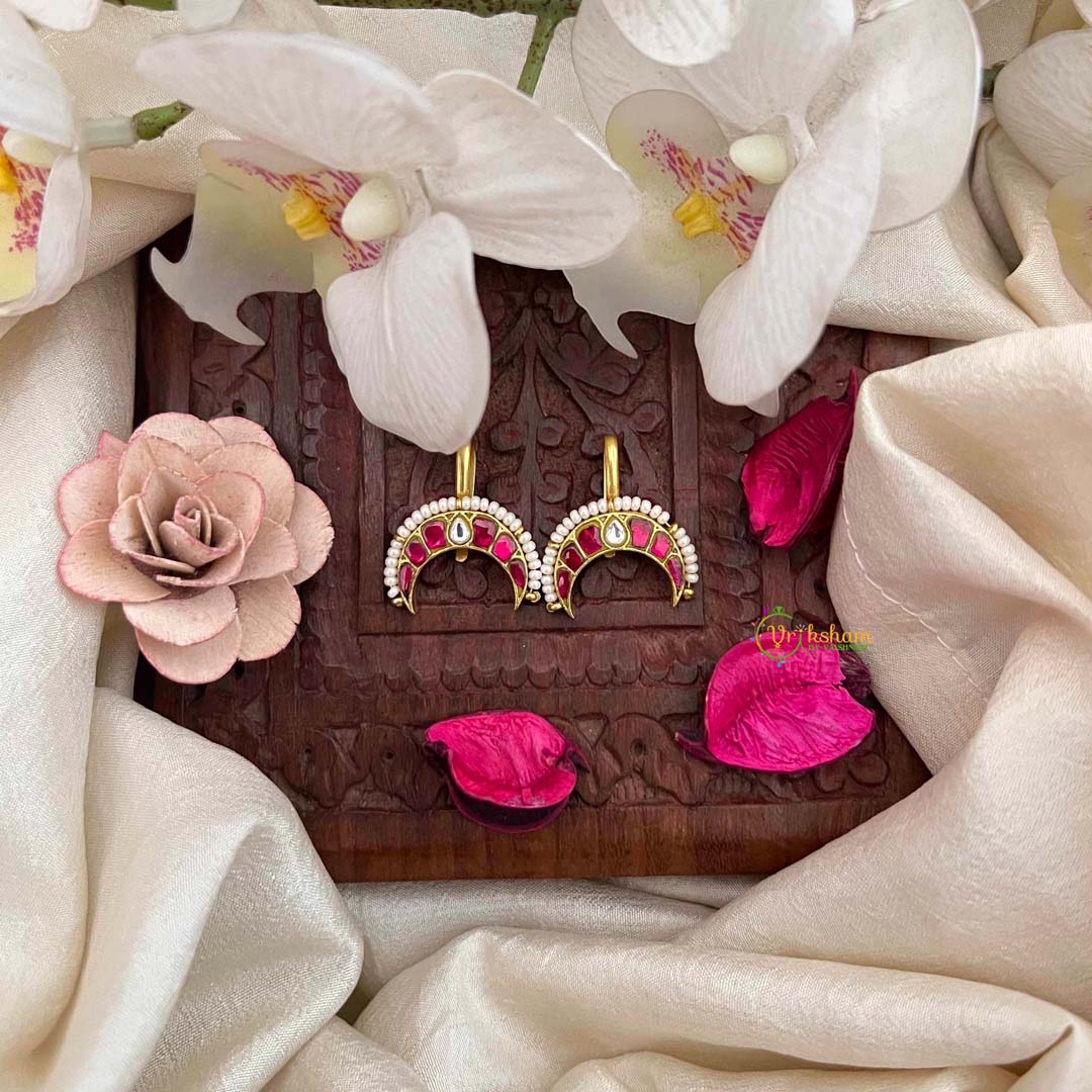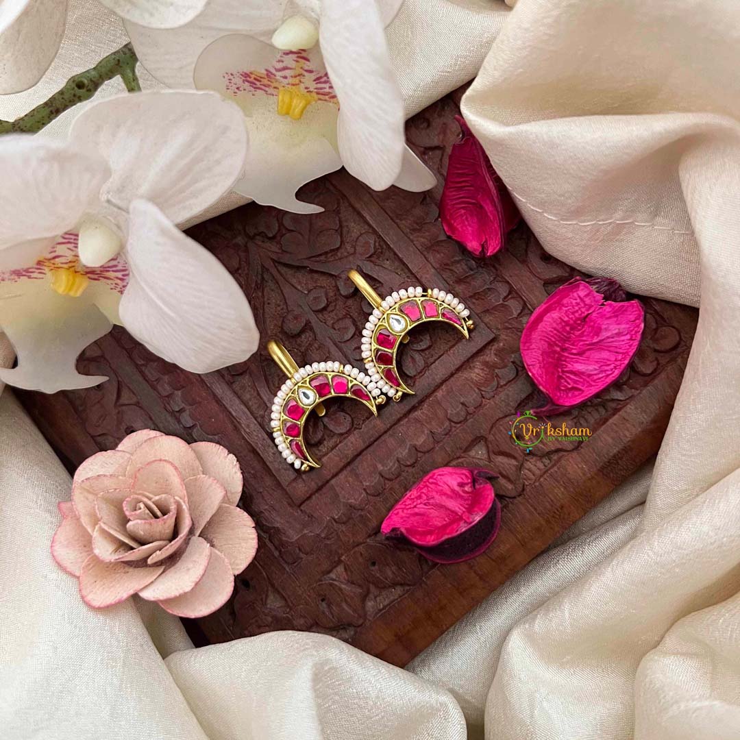 Indulge in opulent refinement with this Gold Plated Half Moon Style Kundan Jadau Bugadi, a radiant testament to luxurious craftsmanship in white and red. The crescent silhouette, enriched with gold plating and adorned with lustrous pearl detailing, creates a luminous composition that captures light with exceptional brilliance. The precious metal finish elevates the traditional Kundan work, adding warmth and richness to the design's inherent elegance. The sophisticated white and red palette strikes a harmonious balance between regal grandeur and refined restraint, making this piece ideal for weddings and grand celebrations. Each element is meticulously positioned through authentic Jadau techniques, ensuring both visual splendor and exceptional durability. A distinguished accessory that honors heritage artistry while delivering contemporary luxury, this bugadi stands as a treasured investment in timeless sophistication and enduring prestige.