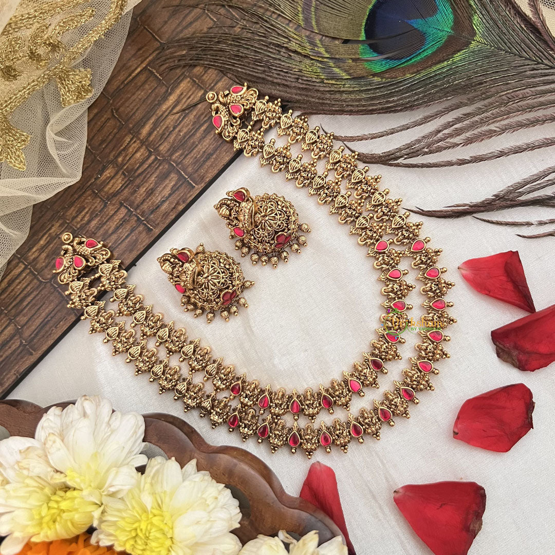 Elevate your elegance with the Vriksham Gold Plated Kemp Stone Lakshmi Neckpiece. Featuring intricate craftsmanship and vibrant red kemp stones, this exquisite piece beautifully highlights the Lakshmi motif, symbolizing prosperity and grace. Perfect for special occasions, it adds a refined touch to traditional and contemporary attire alike.