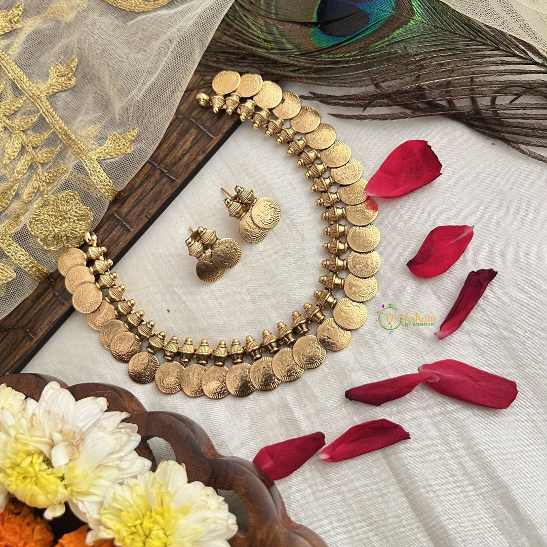 The Vriksham Gold Plated Lakshmi Kasu Mala Neckpiece features intricately designed kasu coins with a detailed Lakshmi motif, all beautifully gold plated. This sophisticated piece combines traditional symbolism with elegant craftsmanship, making it a timeless accessory to enhance your festive or formal attire with grace and cultural richness.