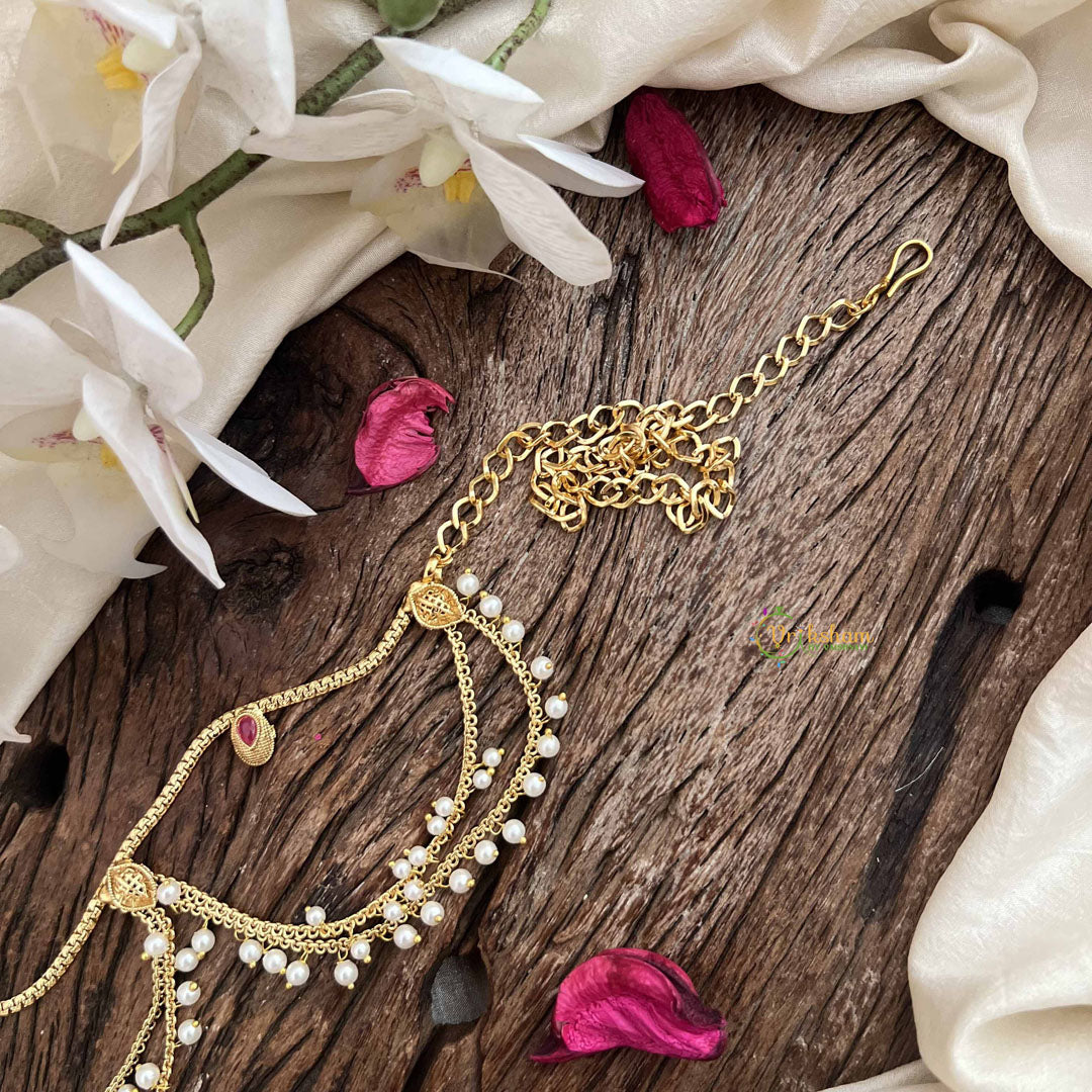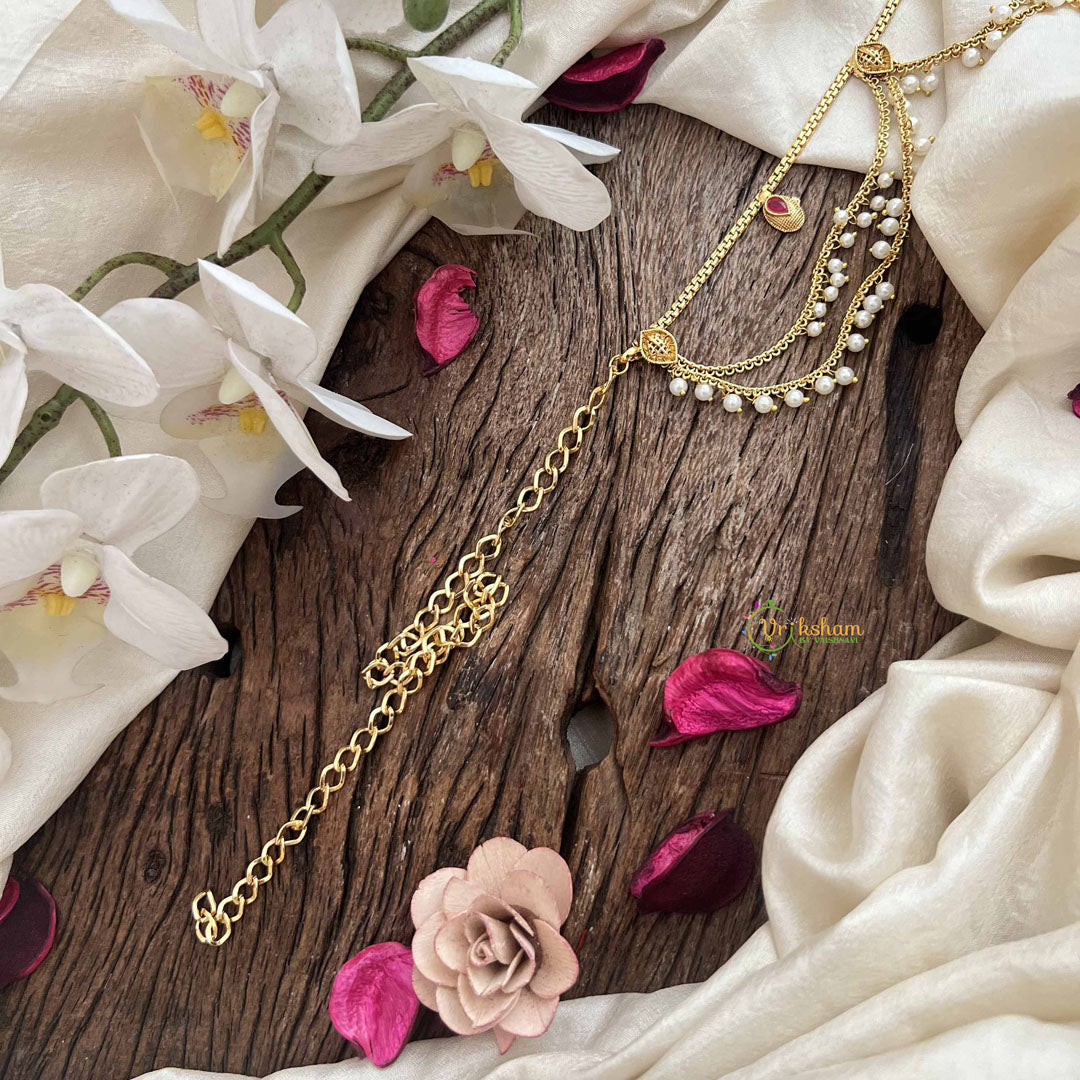 Unveil extraordinary elegance with this resplendent gold-plated pear champ bridal hipchain, showcasing layered double pearl waves in vibrant red and green. This sophisticated accessory celebrates the richness of traditional aesthetics while embracing modern design sensibilities. The harmonious interplay of jewel-toned pearls against warm gold plating creates a mesmerizing visual symphony that captures light beautifully. Each meticulously layered wave flows with graceful movement, adding dimension and depth to your bridal ensemble. An exceptional piece for the bride who appreciates jewelry that honors cultural heritage while radiating contemporary sophistication and timeless beauty.
