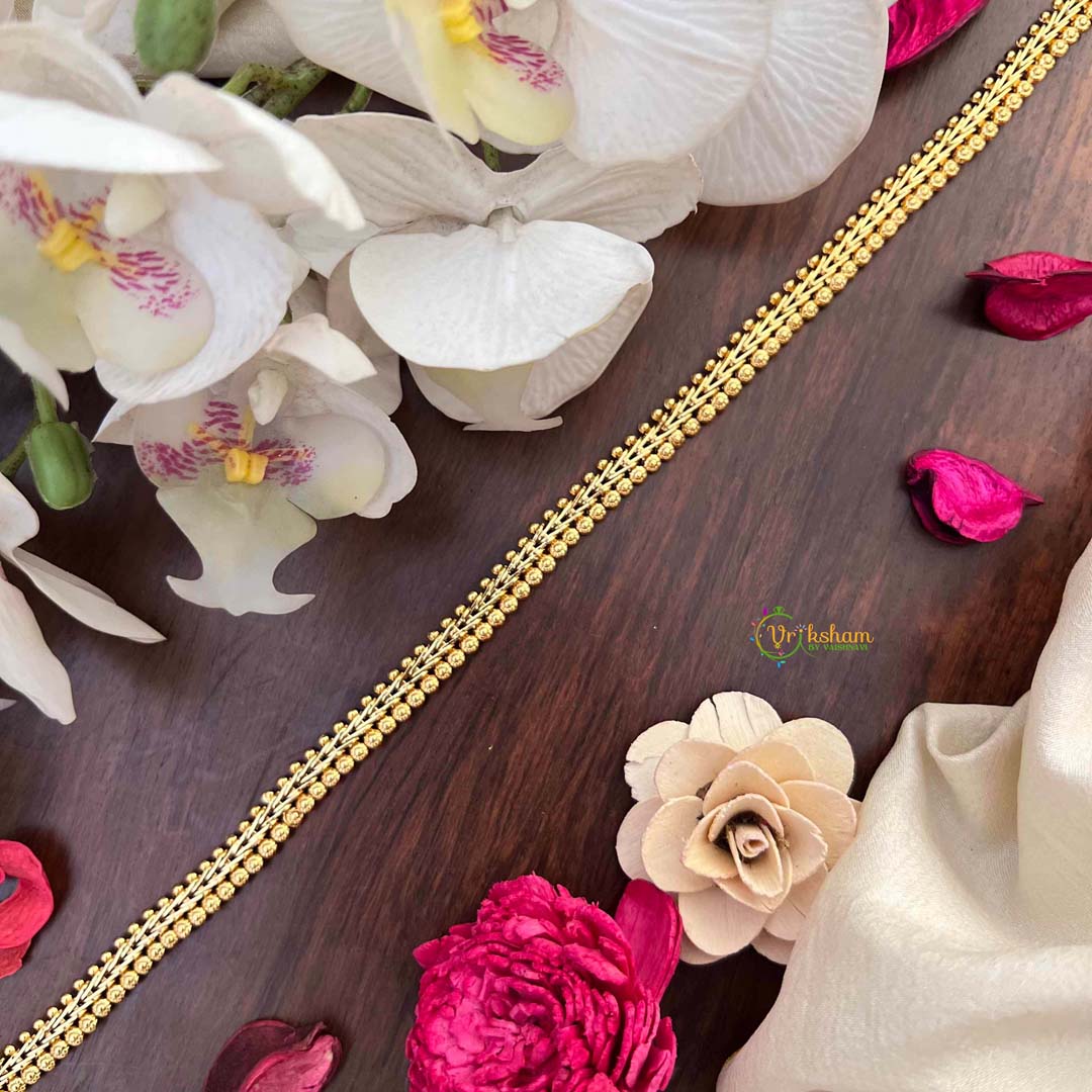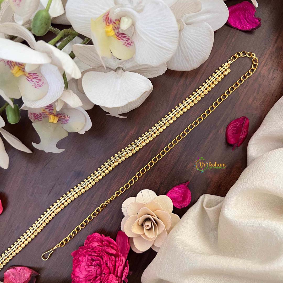 Elevate your traditional ensemble with this exquisite gold-plated hip chain, a timeless accessory that seamlessly blends heritage craftsmanship with contemporary elegance. Featuring intricately designed beaded elements, this chain drapes gracefully along the hips, adding a touch of opulence to ethnic wear. The lustrous gold plating ensures a radiant finish that complements both festive occasions and everyday celebrations. Perfect for those who appreciate the artistry of traditional jewelry, this piece transforms any outfit into a statement of refined style and cultural pride.