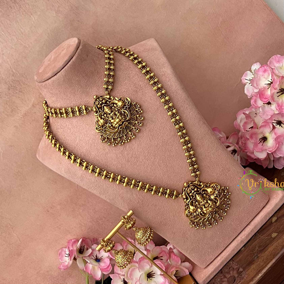 Celebrate divine prosperity with this elegant bridal set, featuring a revered Lakshmi idol complemented by a matching Lakshmi pendant. Adorned with rich red and verdant green beads accented with lustrous gold, this collection radiates opulence and spiritual significance. The thoughtful pairing of dual Lakshmi elements creates a powerful symbol of abundance and blessings, while the sophisticated color palette enhances its refined aesthetic appeal. Meticulously crafted for brides who seek jewelry that honors sacred traditions while exuding contemporary elegance and timeless grace.