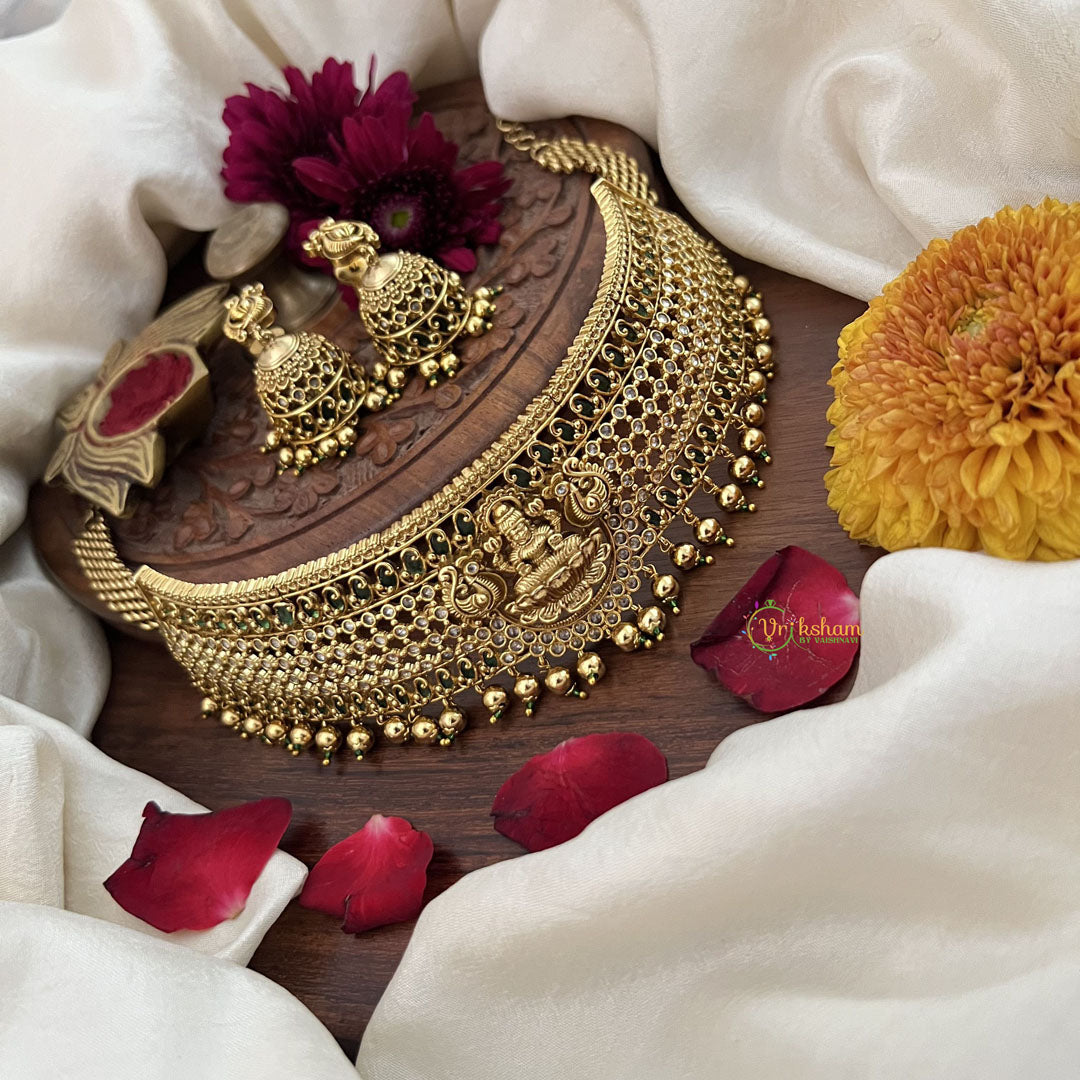 The Vriksham Gold Polish Peacock Lakshmi High Neck Choker features elegant green accents paired with intricate gold beadwork, showcasing detailed motifs of the peacock and Goddess Lakshmi. This sophisticated design combines traditional symbolism with refined craftsmanship, making it a striking accessory to enhance your festive and formal attire with timeless elegance.
