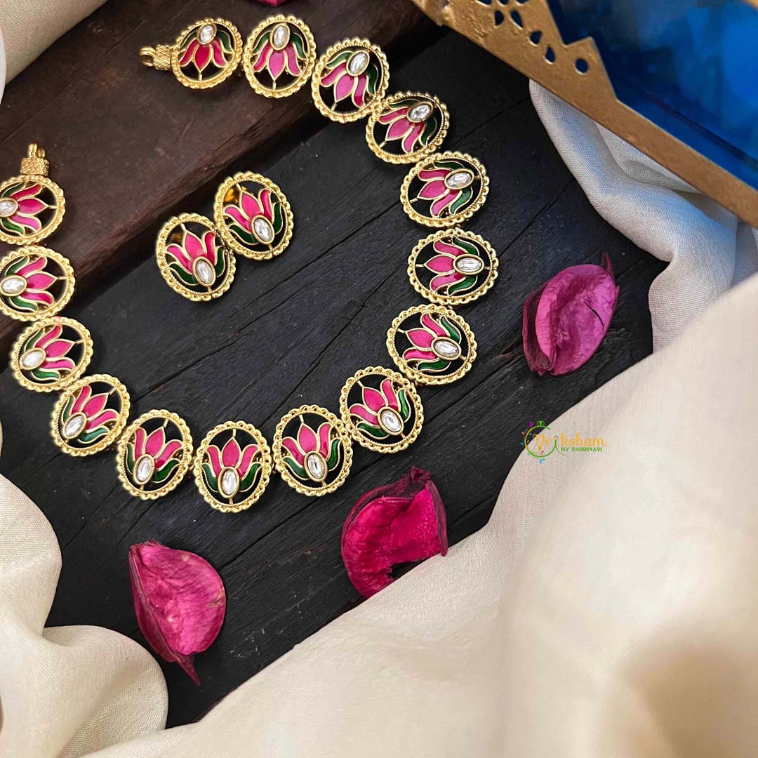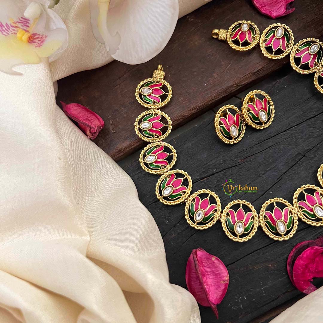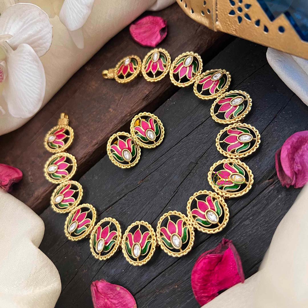 Elevate your everyday elegance with this exquisite gold-tone neckpiece, featuring a delicate pink lotus enamel pendant adorned with vibrant white, red, and green accents. The lotus motif symbolizes purity and grace, while the refined craftsmanship showcases intricate enamel work that catches light beautifully. Perfect for layering or wearing solo, this short neckpiece adds a touch of sophisticated charm to both casual and formal ensembles. A timeless piece that celebrates traditional artistry with contemporary style.