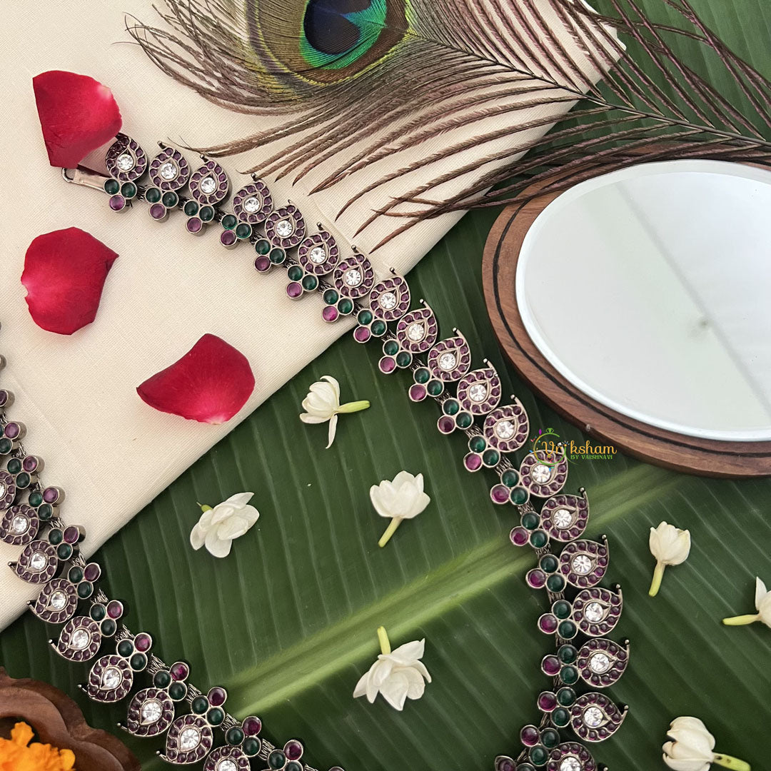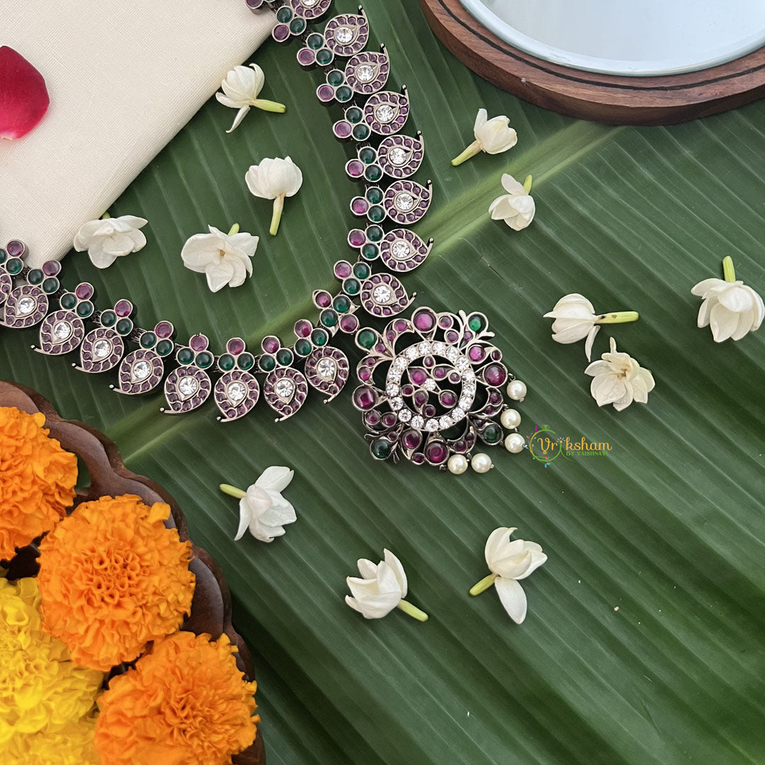 The Vriksham Gold-Tone Ruby Kemp Stone Floral Pendant Long Neckpiece showcases a refined blend of red, green, and white stones accented with pearls. Its elegant floral pendant design and gold-tone finish create a sophisticated accessory that enhances both traditional and modern attire, making it an ideal choice for graceful occasions.