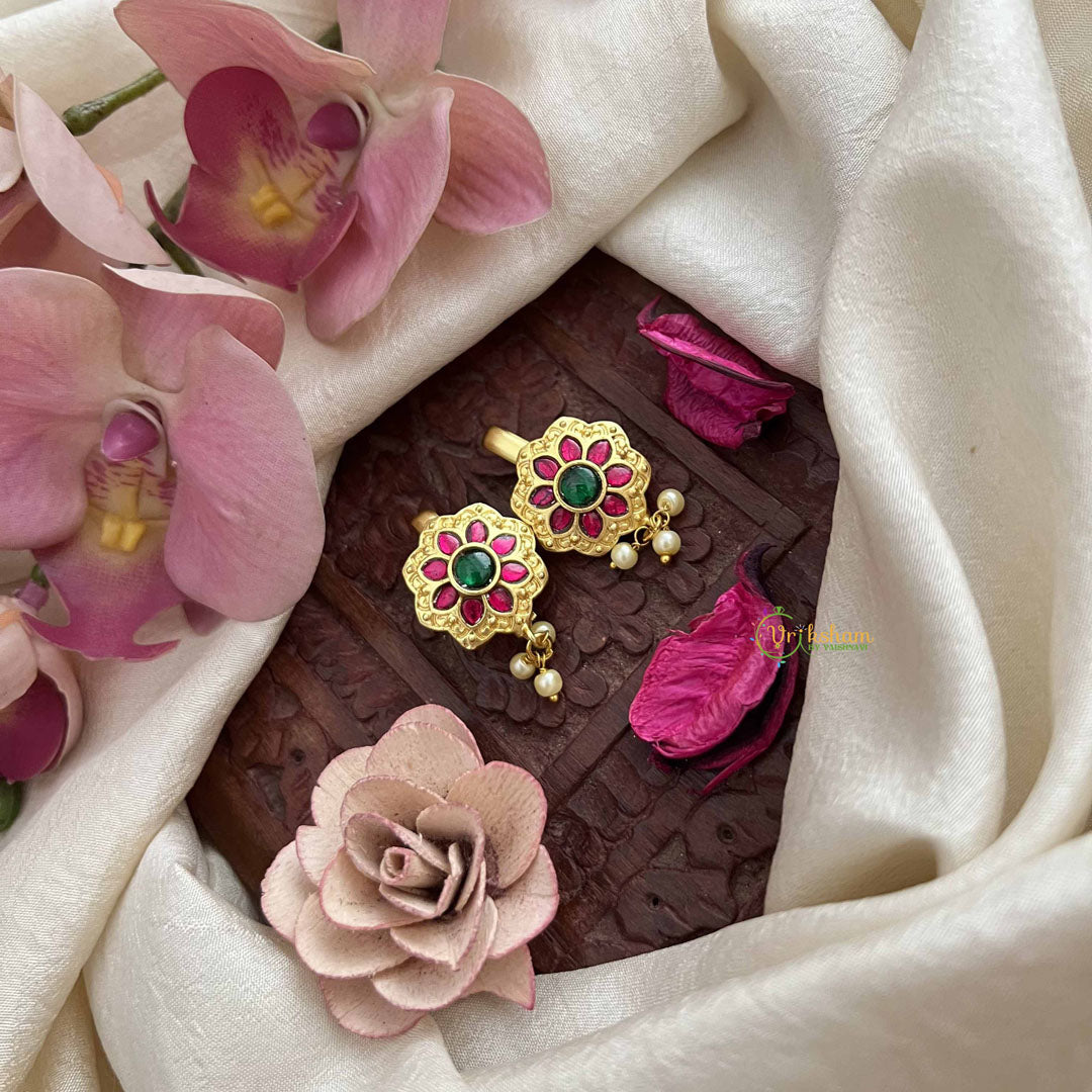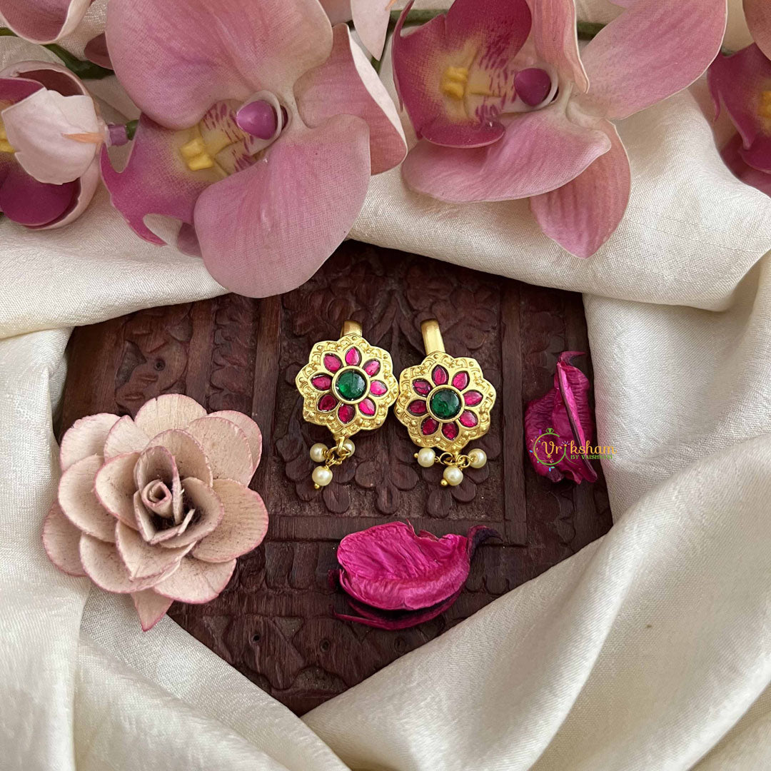The Vriksham Golden Colted Floral Style Kundan Jadau Press Bugadi features a luxurious floral design in rich green and red tones, beautifully highlighted by lustrous pearls. Crafted with expert Kundan and Jadau techniques, this piece radiates timeless elegance and sophistication, making it a distinguished accessory for your finest occasions.