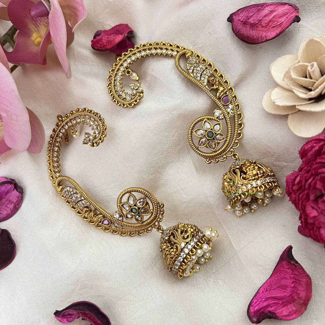 Embrace opulent bridal elegance with this stunning golden jhumka featuring a seven-leaf floral design paired with a coordinating ear cuff. The rich combination of white, red, and green accents creates a vibrant yet refined aesthetic that celebrates traditional craftsmanship. Each leaf is meticulously detailed in gleaming gold, capturing light beautifully throughout your celebration. This dual-piece ensemble offers versatile styling, allowing you to wear the jhumka alone or combine it with the ear cuff for a complete, luxurious bridal look that exudes timeless sophistication and cultural grace.