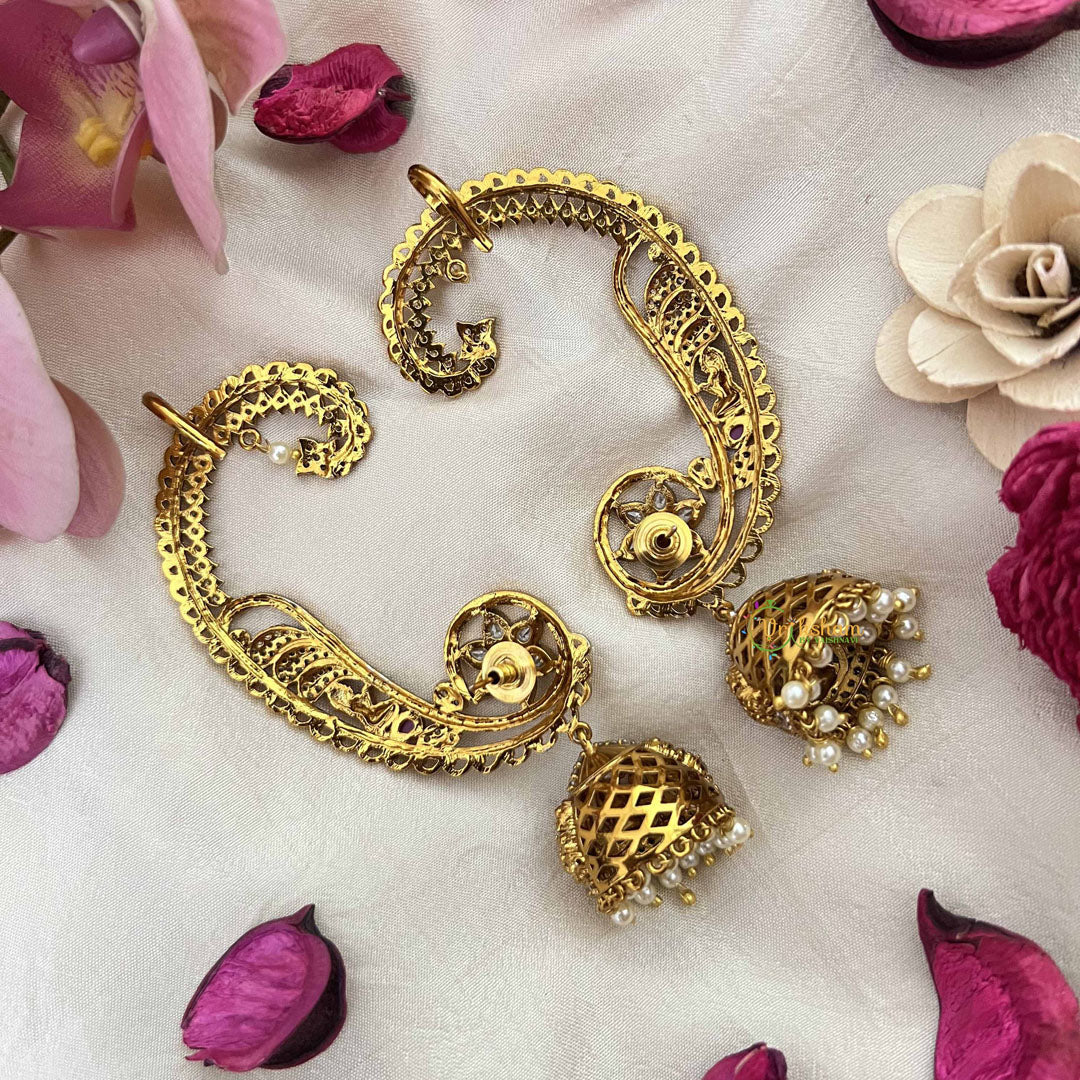 Color, shades, texture displayed may slightly vary from the actual product due to photography limitations. We humbly request you to consider these variations. We try Elevate your elegance with the Vriksham Royal Peacock Kundan Jadau Jhumkas, exquisitely crafted with intricate peacock motifs and adorned with lustrous pearls. The detailed maatil design is complemented by matching ear cuffs, creating a harmonious and regal accessory set perfect for special occasions. This sophisticated jewelry merges traditional craftsmanship with timeless beauty, enhancing your ensemble with a graceful, luxurious touch.our best to deliver the product pictures to 99% similar to the actual product. BEWARE of IMAGE RE-USAGE/COPYRIGHT VIOLATION across the INTERNET. This image belongs to www.vrikshamindia.com only. It is authentically taken by our in-house photographers in natural light without any editing or filters in place and is copyrighted to us. Any stealing/infringement or usage of this pic for sales/advertisement purposes is subject to legal action.
