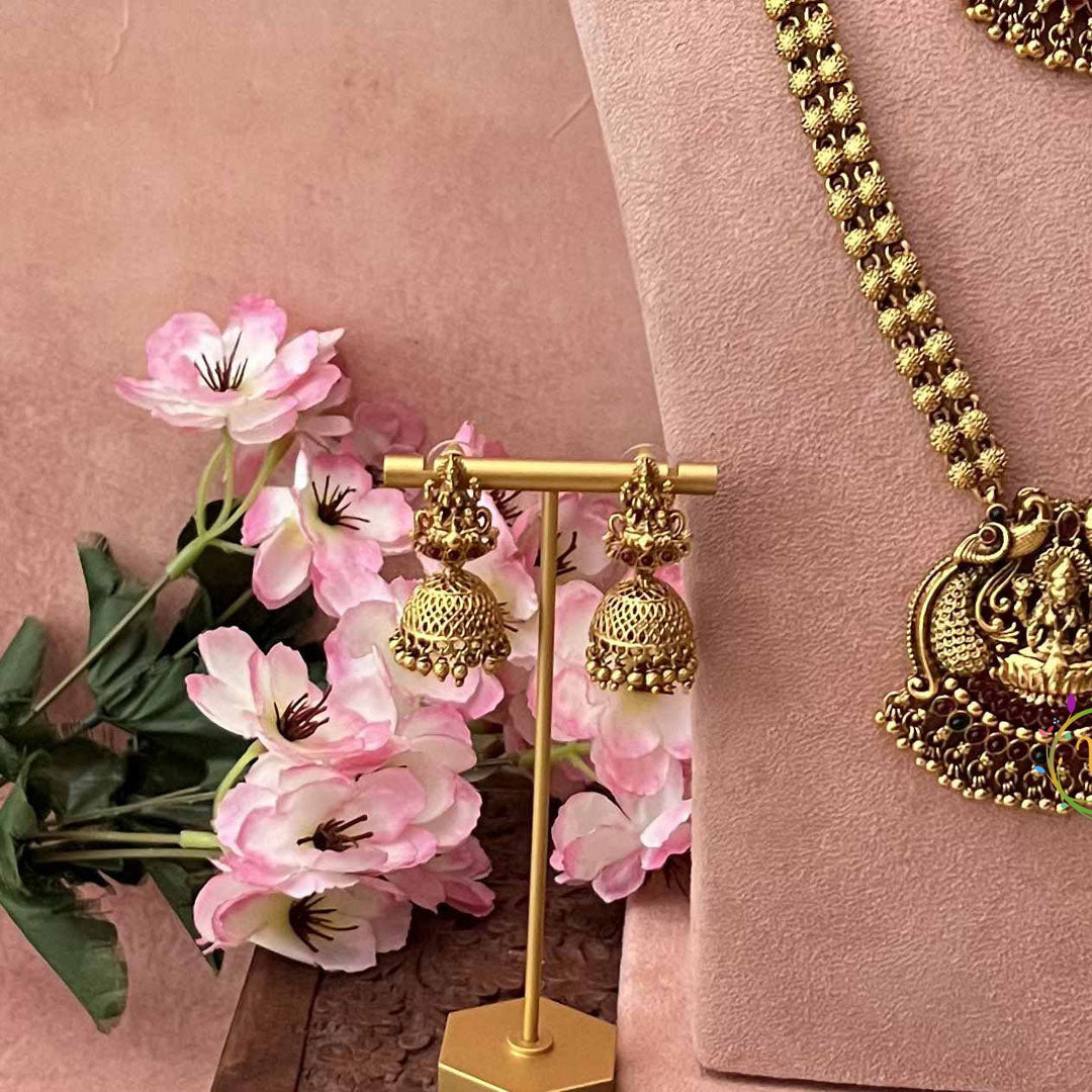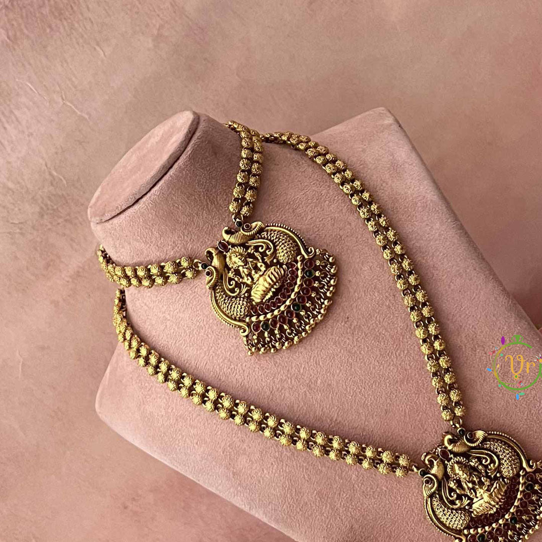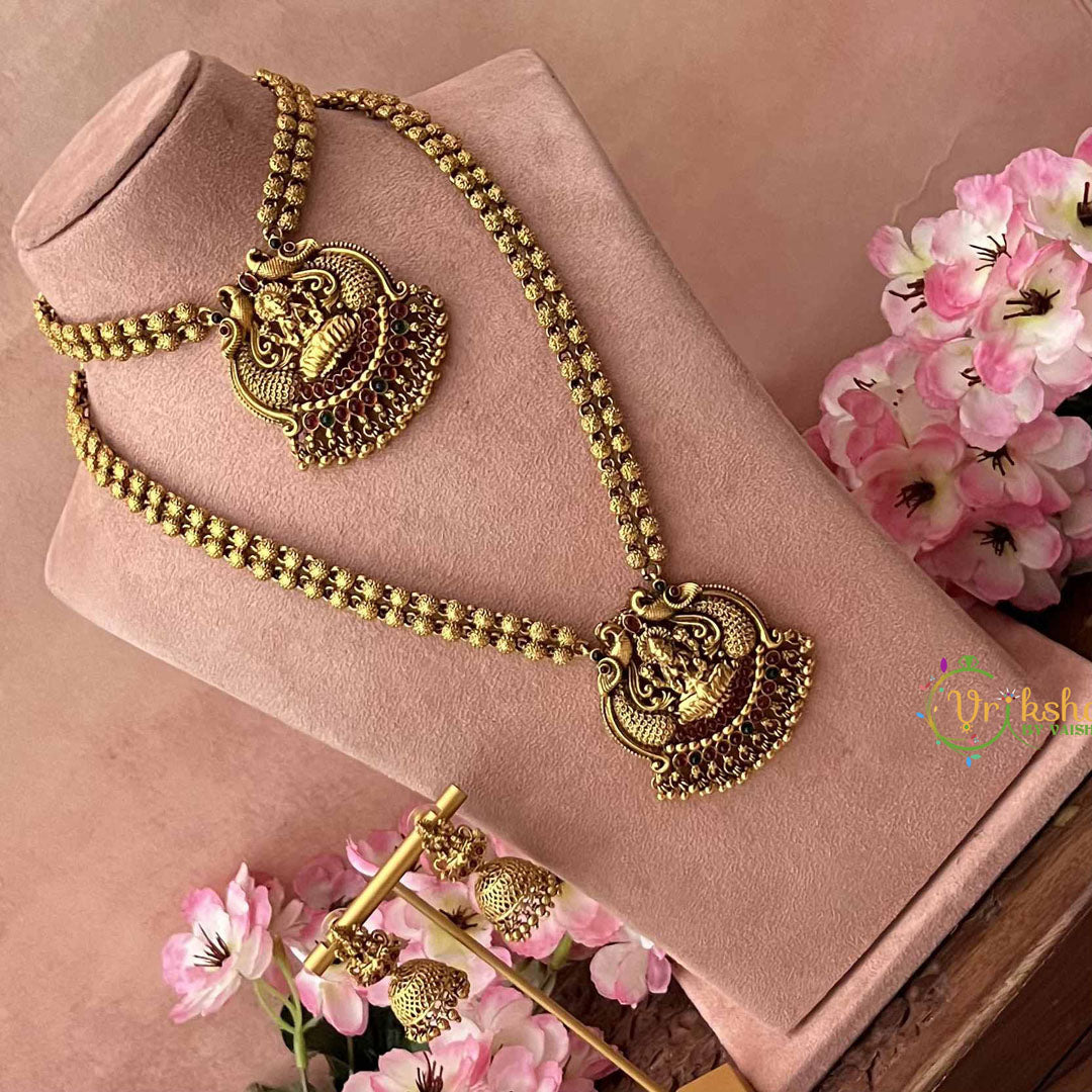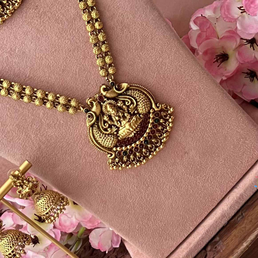 Indulge in understated luxury with this golden bridal set, showcasing an ornate floral kasu mala paired with a graceful lotus Lakshmi pendant. The harmonious blend of intricate botanical motifs and sacred symbolism creates a piece of remarkable elegance and cultural resonance. Crafted with meticulous attention to detail, this collection radiates warmth and prosperity, making it an ideal selection for brides who value both aesthetic refinement and spiritual significance. A treasured heirloom that captures the essence of traditional Indian bridal artistry.